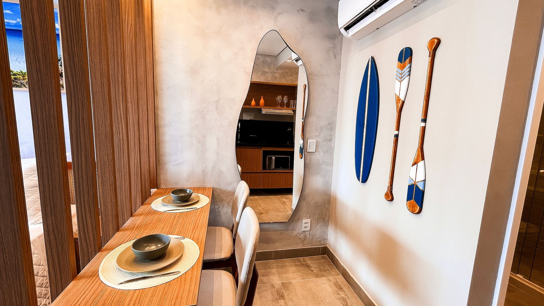 Living provides bed and bath linens, as well as some complimentary amenities. The flat features air conditioning, a Smart TV, and a dining table with chairs. The kitchen includes some utensils for meal preparation, such as a sandwich maker, cooktop, pots, and a coffee maker. Additionally, the apartment has a hairdryer. The building offers a swimming pool, kayaks and boards, and a laundry room, which guests can use by paying for the machine. We also provide cribs and beach chairs, subject to availability.