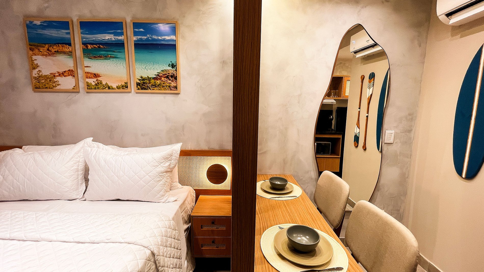 TheFlat Studio c/ varanda #2 , accommodates 2 people with a double bed, air conditioning, and a Smart TV. The kitchen is compact, equipped with a cooktop, microwave, coffee maker, sandwich maker, refrigerator, and utensils for quick meals. The building offers a rooftop pool, gym, laundry facilities, and rotating parking. An excellent condominium facing the sea, located close to restaurants, bakeries, gas stations, and small markets. Comfort and convenience for your stay