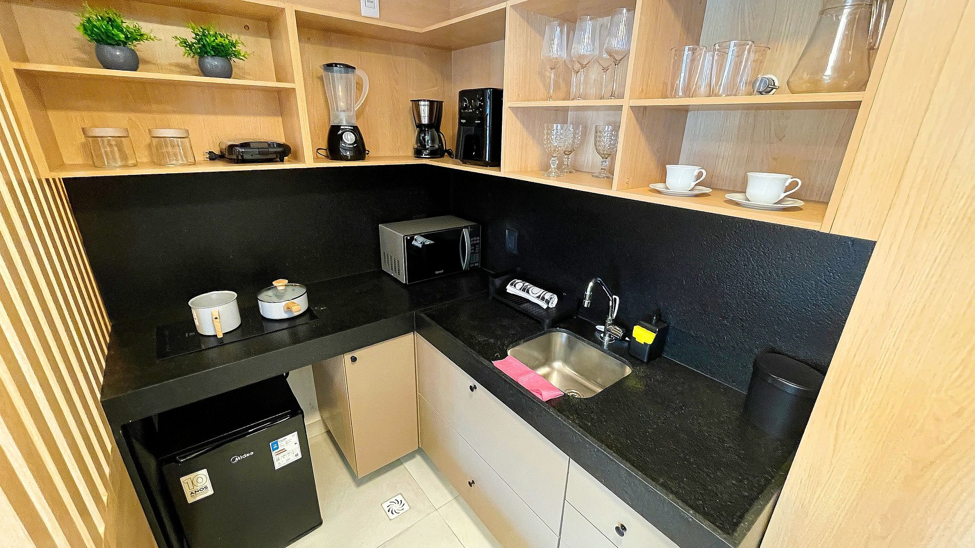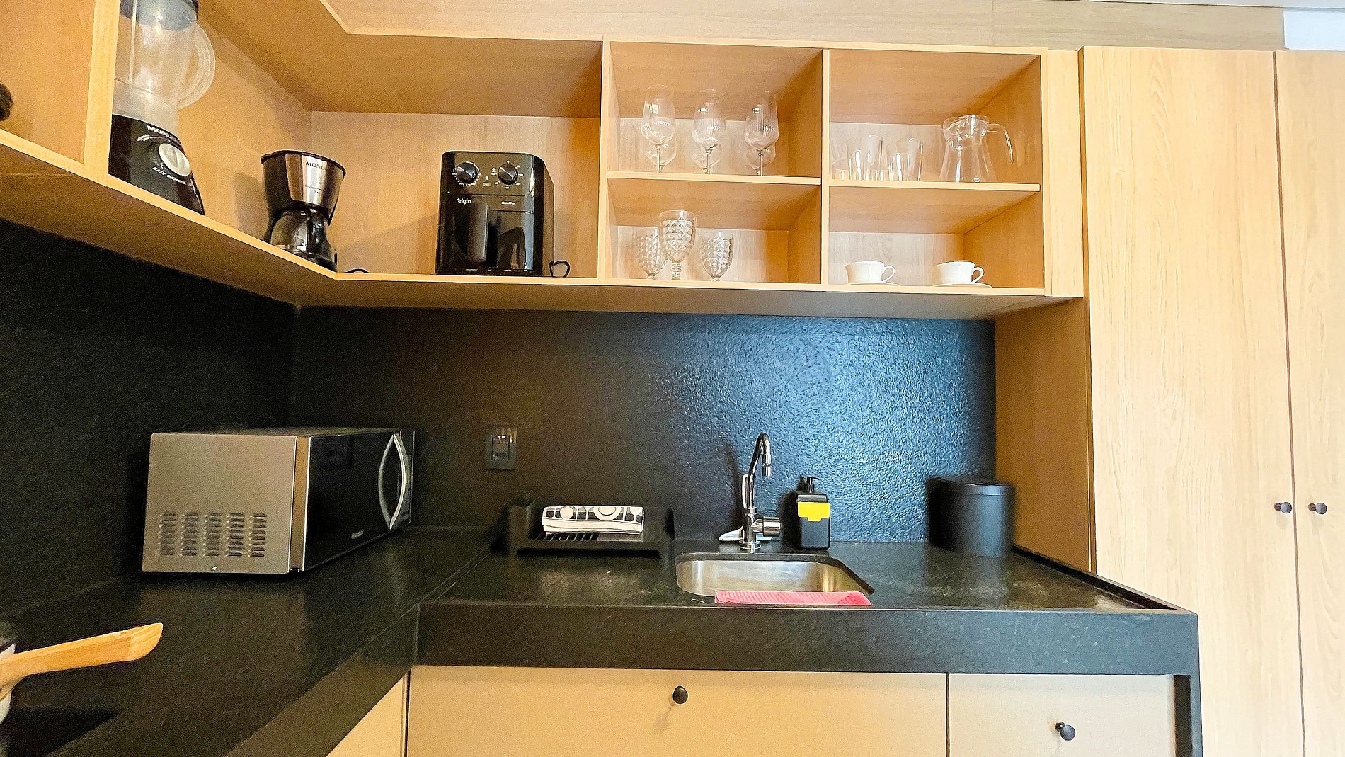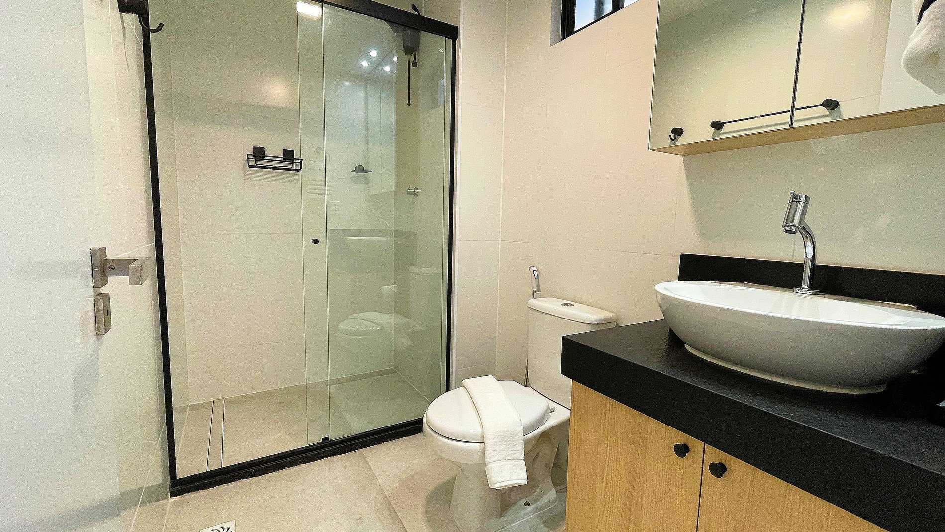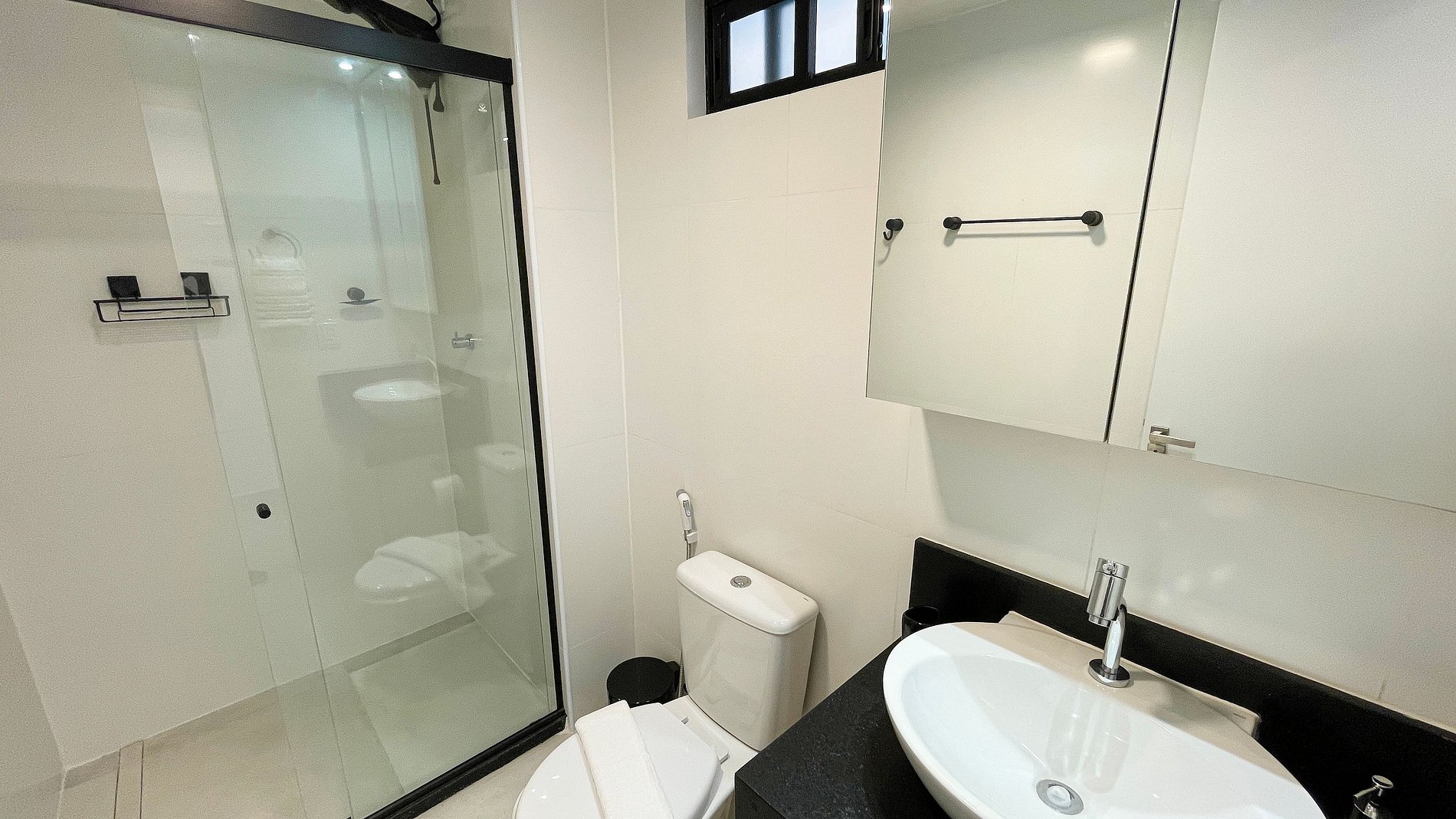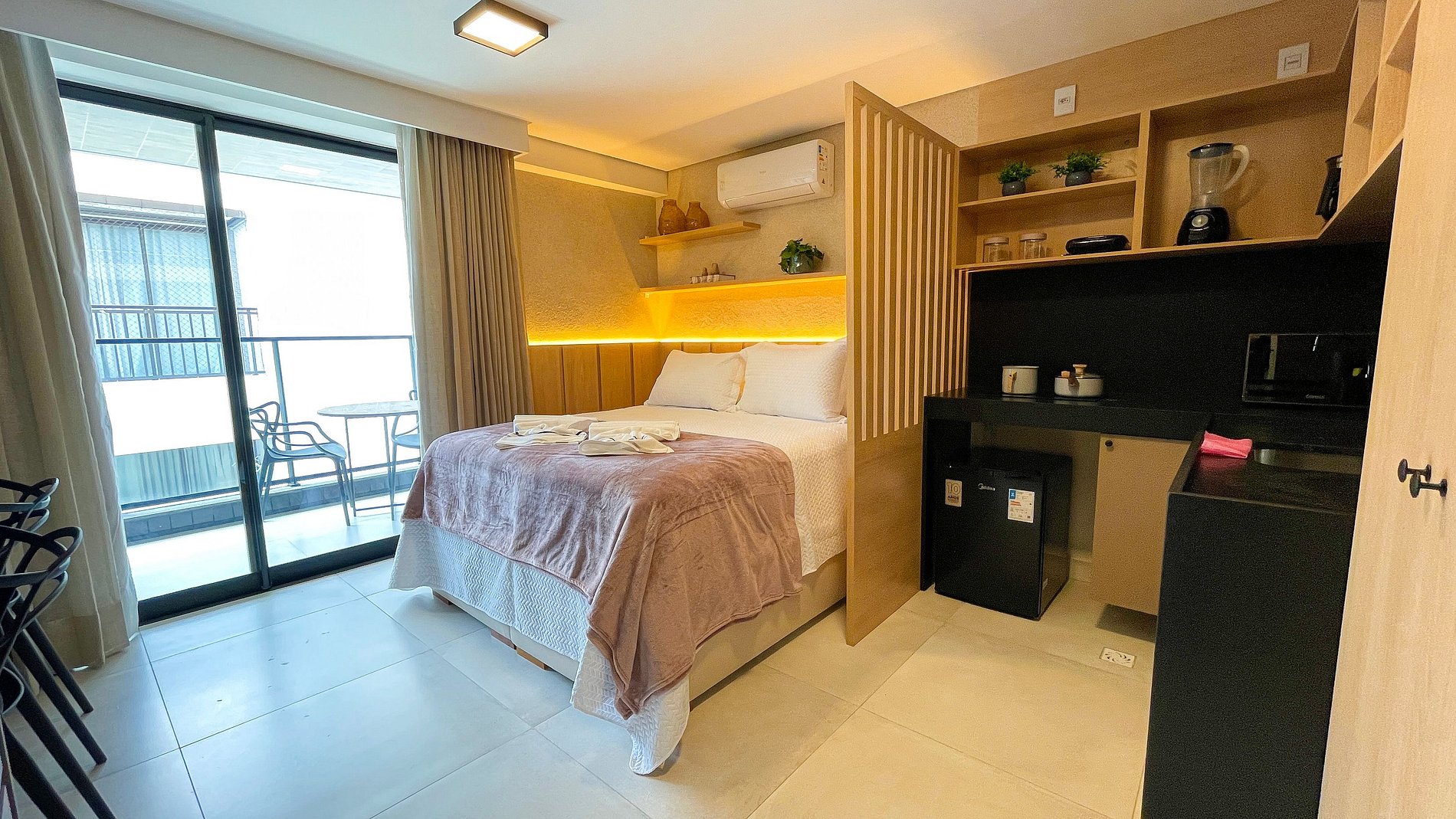 Flat with capacity to accommodate up to 4 guests, featuring 1 queen-size bed and 2 single mattresses. It has a side balcony with a table and chairs, and a fully equipped kitchen with a cooktop, microwave, coffee maker, sandwich maker, minibar, among other items. The unit includes a Smart TV, air conditioning, and a dining area. The building offers a rooftop pool, coworking space, gym, and laundry facilities. It is located close to restaurants, pharmacies, bakeries, and convenience stores.