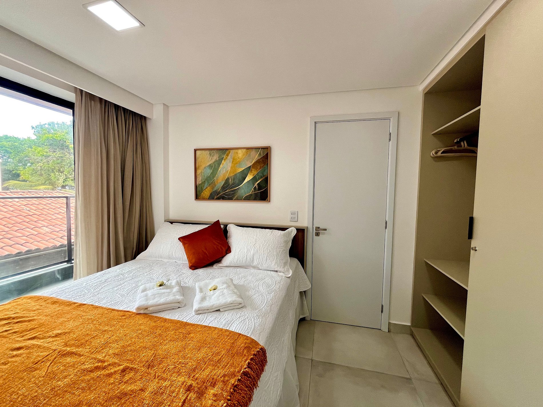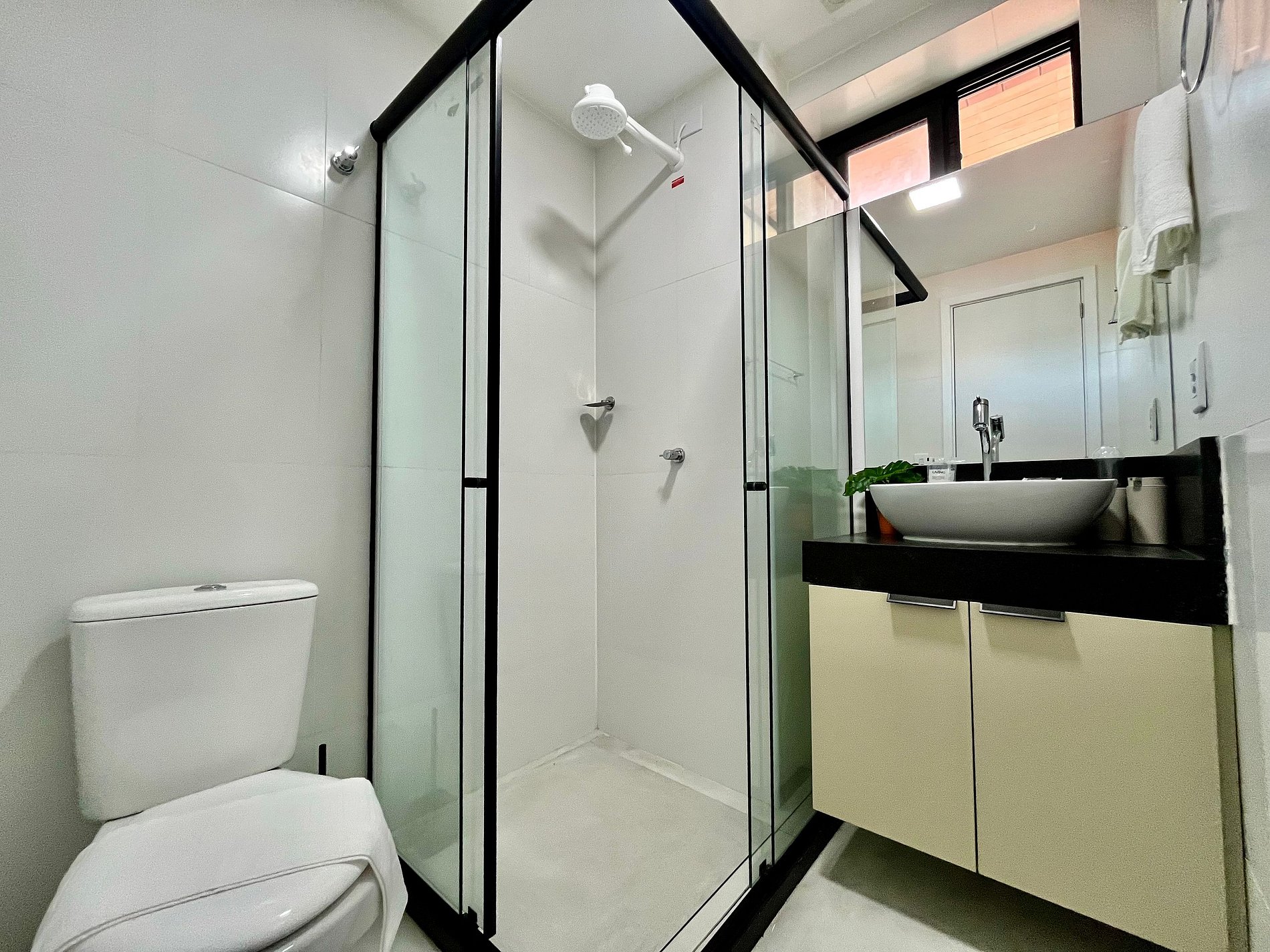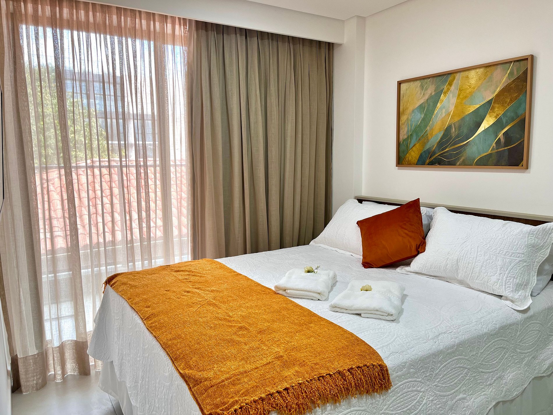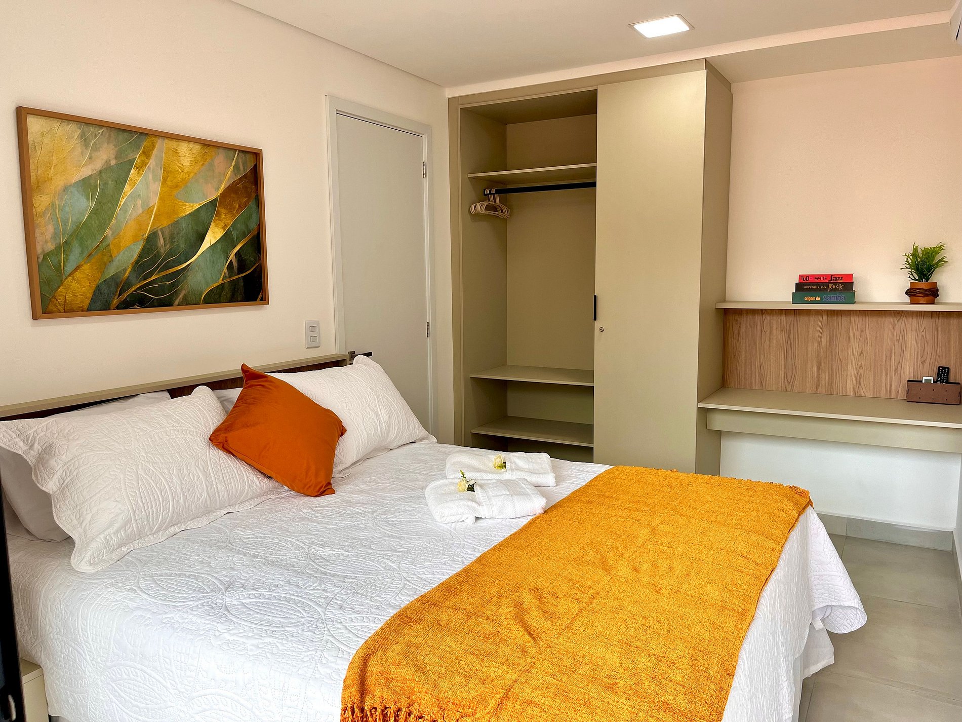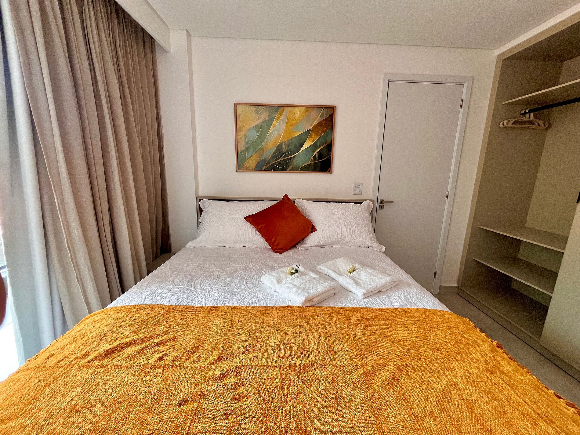 Flat with 43m², accommodating up to 3 people, featuring a queen bed and a sofa bed. It has a side balcony with a partial sea view with a table and chairs, and a kitchen equipped with a cooktop, microwave, coffee maker, sandwich maker, refrigerator, and other items. It includes a Smart TV, air conditioning, and a dining area.The building offers a rooftop pool, coworking space, gym, and laundry facilities. It is close to restaurants, pharmacies, bakeries, a gas station, and convenience stores.