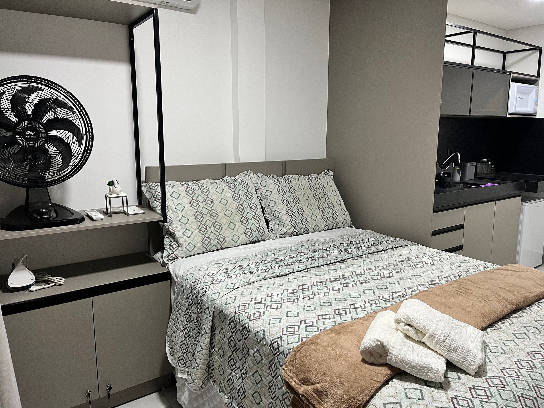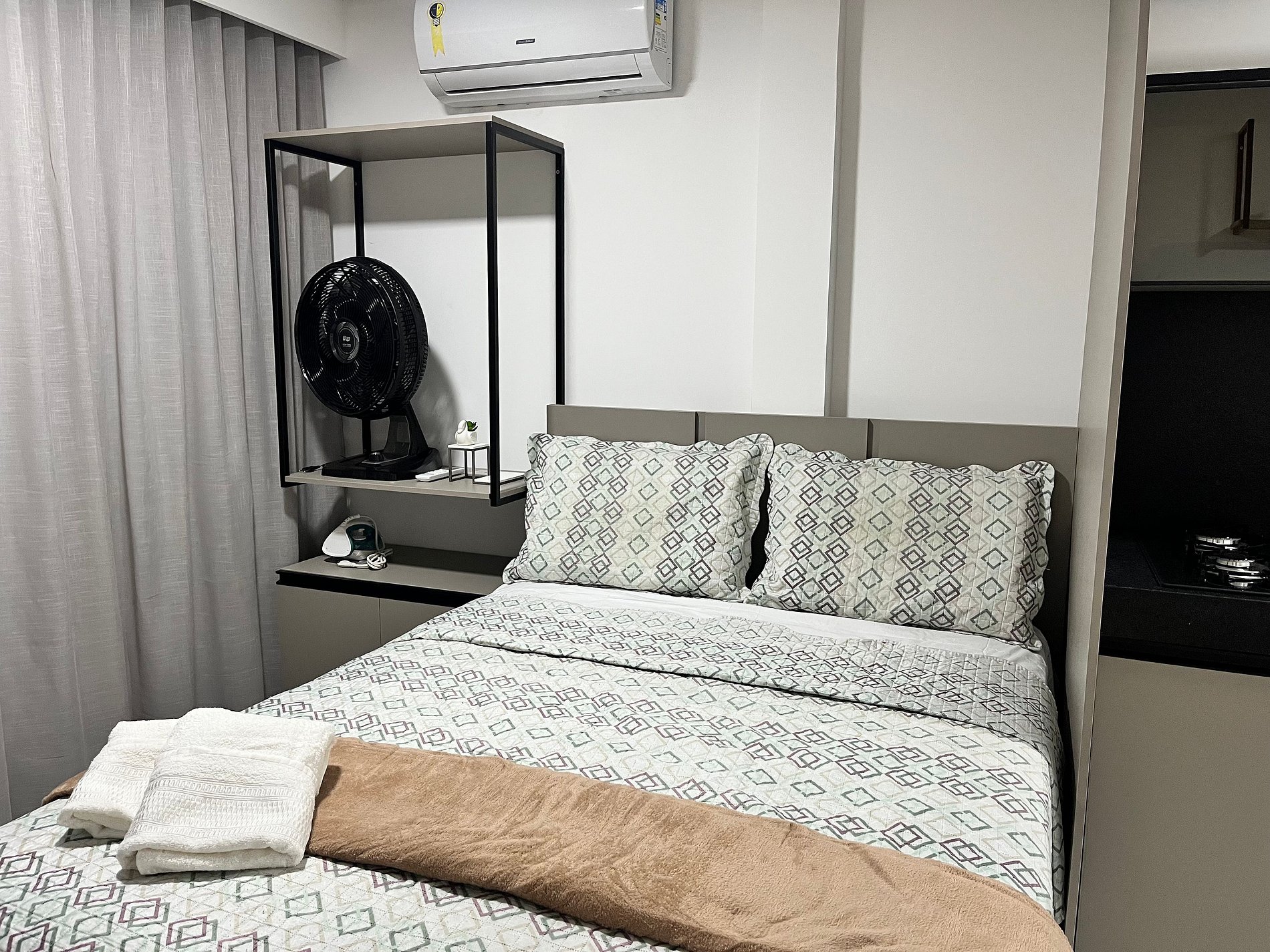 Flat with 27m², comfortably accommodating a couple. It features an outdoor area, a kitchen equipped with a cooktop, microwave, coffee maker, sandwich maker, minibar, and some cooking utensils. It includes a Smart TV, air conditioning, and a table with chairs for meals. The building offers a rooftop pool, coworking space, gym, and laundry facilities. It is close to restaurants, pharmacies, bakeries, a gas station, and convenience stores.
