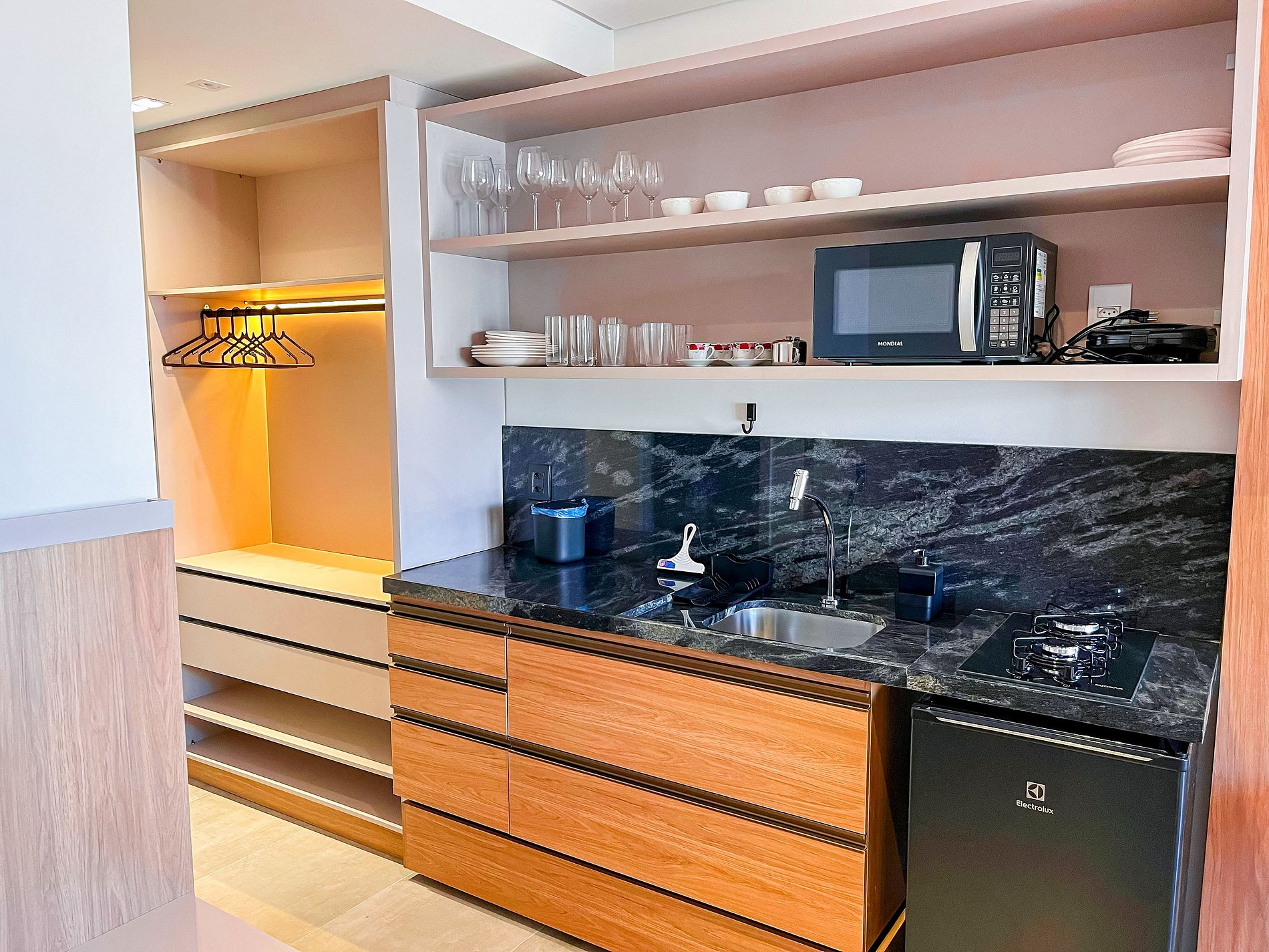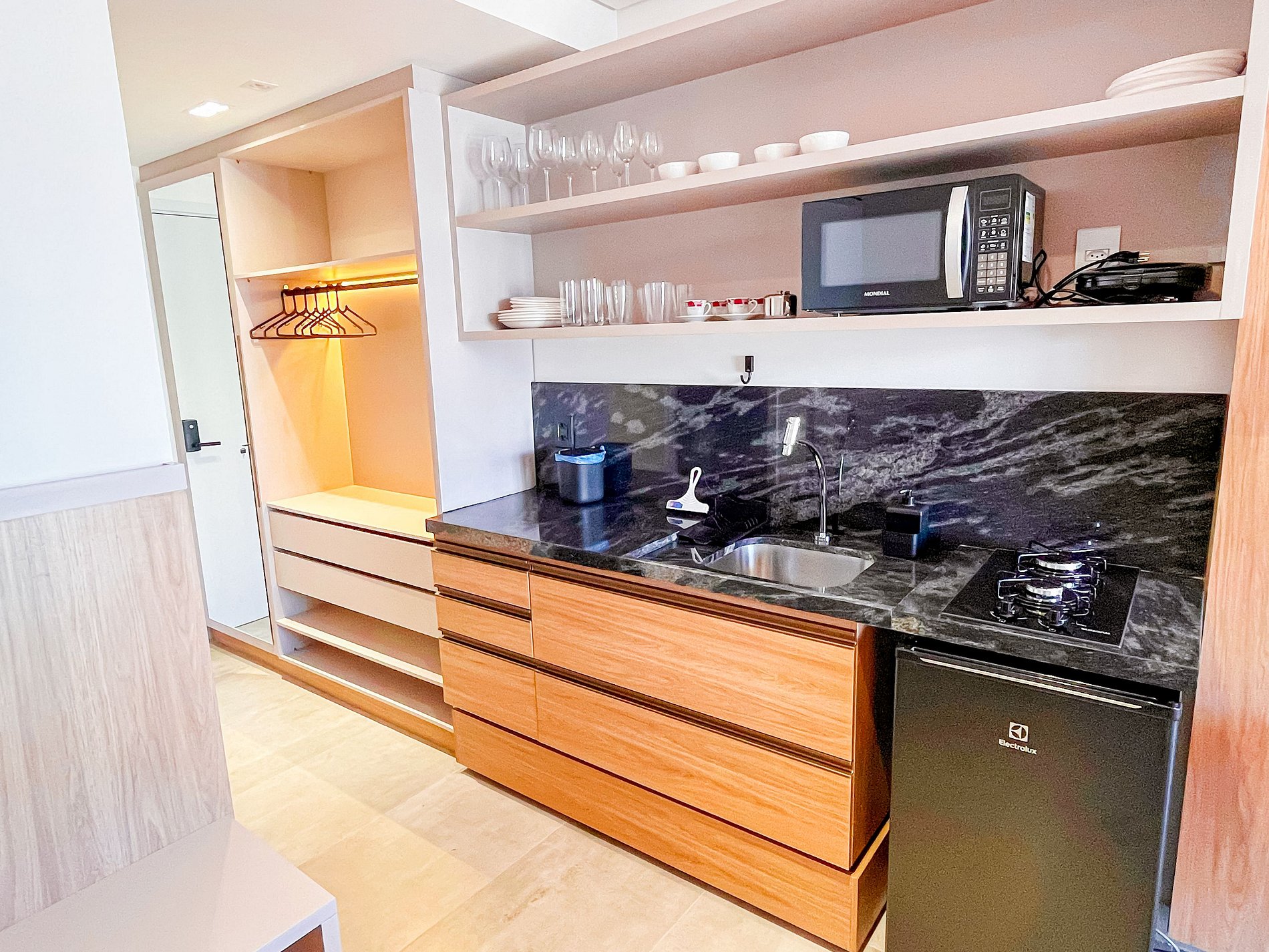 The Studio with Partial View #3 accommodates 03 people featuring a queen-size bed with an additional single bed, air conditioning and a Smart TV. The kitchenette is compact and equipped with a cooktop, microwave, coffee maker, sandwich maker, minibar, and utensils for quick meals. The building offers a rooftop pool, gym, laundry room, and rotating parking. Excellent beachfront condo, close to restaurants, bakeries, gas stations, and small markets. Comfort and convenience for your stay!
