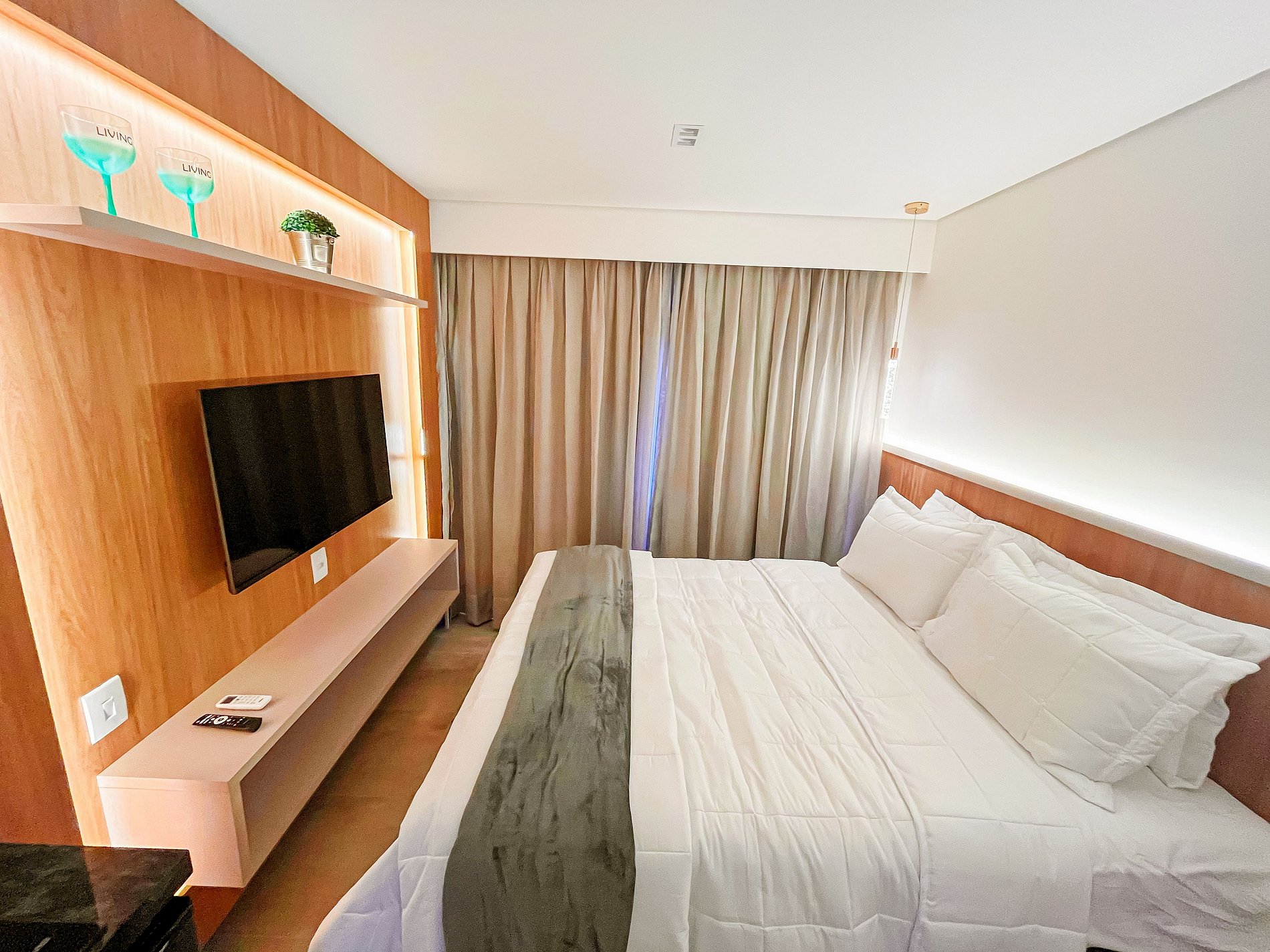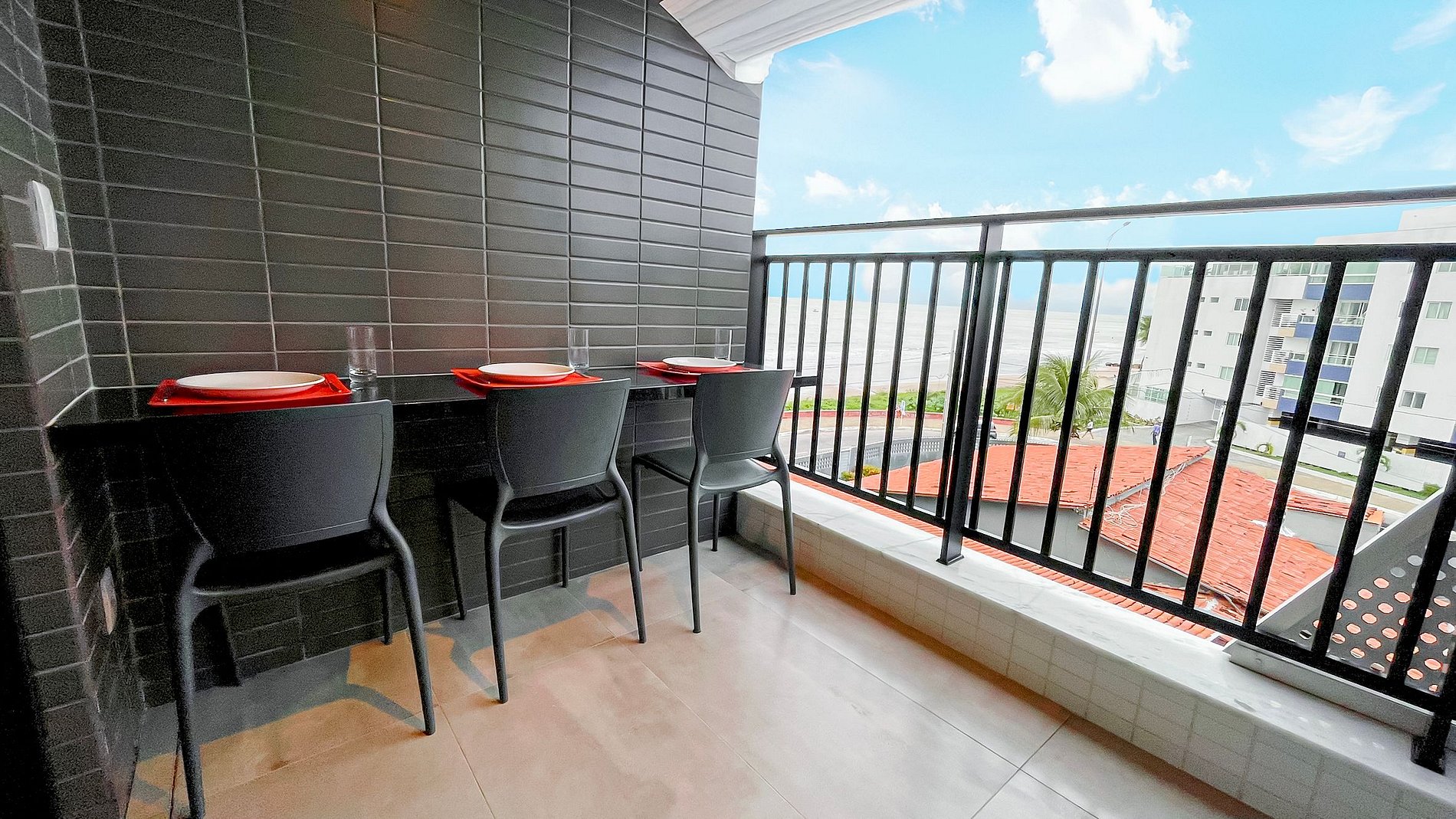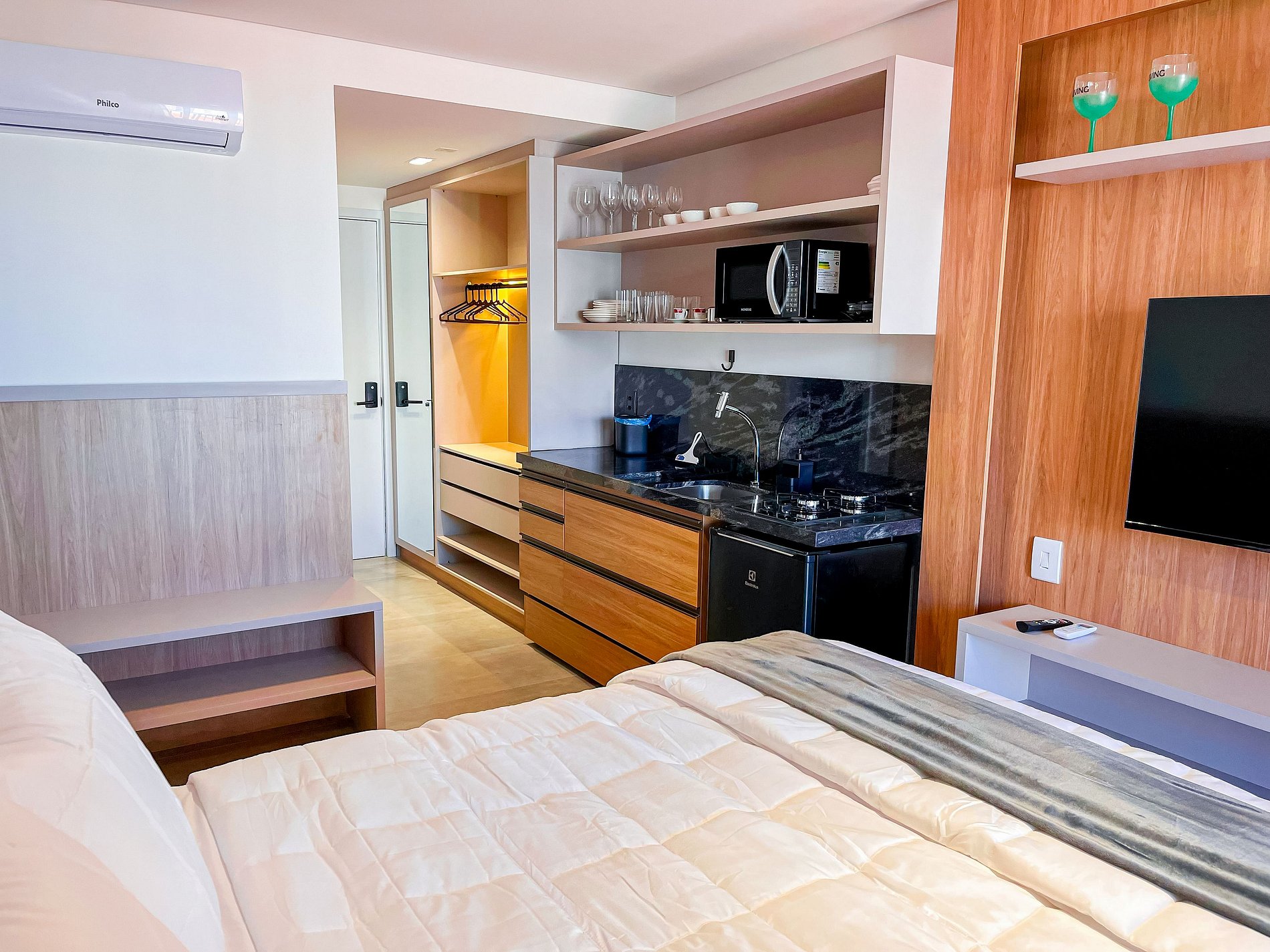 The Studio with Partial View #3 accommodates 03 people featuring a queen-size bed with an additional single bed, air conditioning and a Smart TV. The kitchenette is compact and equipped with a cooktop, microwave, coffee maker, sandwich maker, minibar, and utensils for quick meals. The building offers a rooftop pool, gym, laundry room, and rotating parking. Excellent beachfront condo, close to restaurants, bakeries, gas stations, and small markets. Comfort and convenience for your stay!