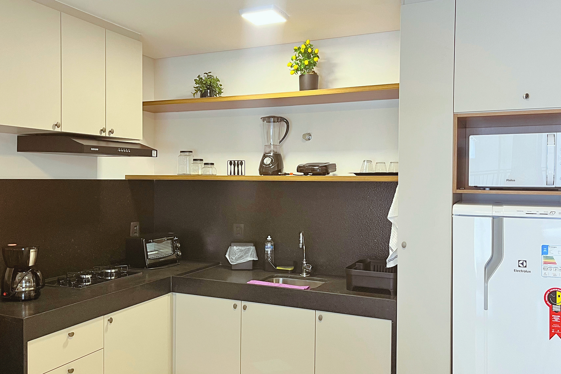 Living ofrece ropa de cama y baño, así como algunos amenities de cortesía. El flat cuenta con aire acondicionado, Smart TV, mesa y sillas para las comidas. La cocina está equipada con utensilios para la preparación de alimentos, como sandwichera, encimera, ollas y cafetera. Además, el apartamento dispone de secador de pelo y plancha.