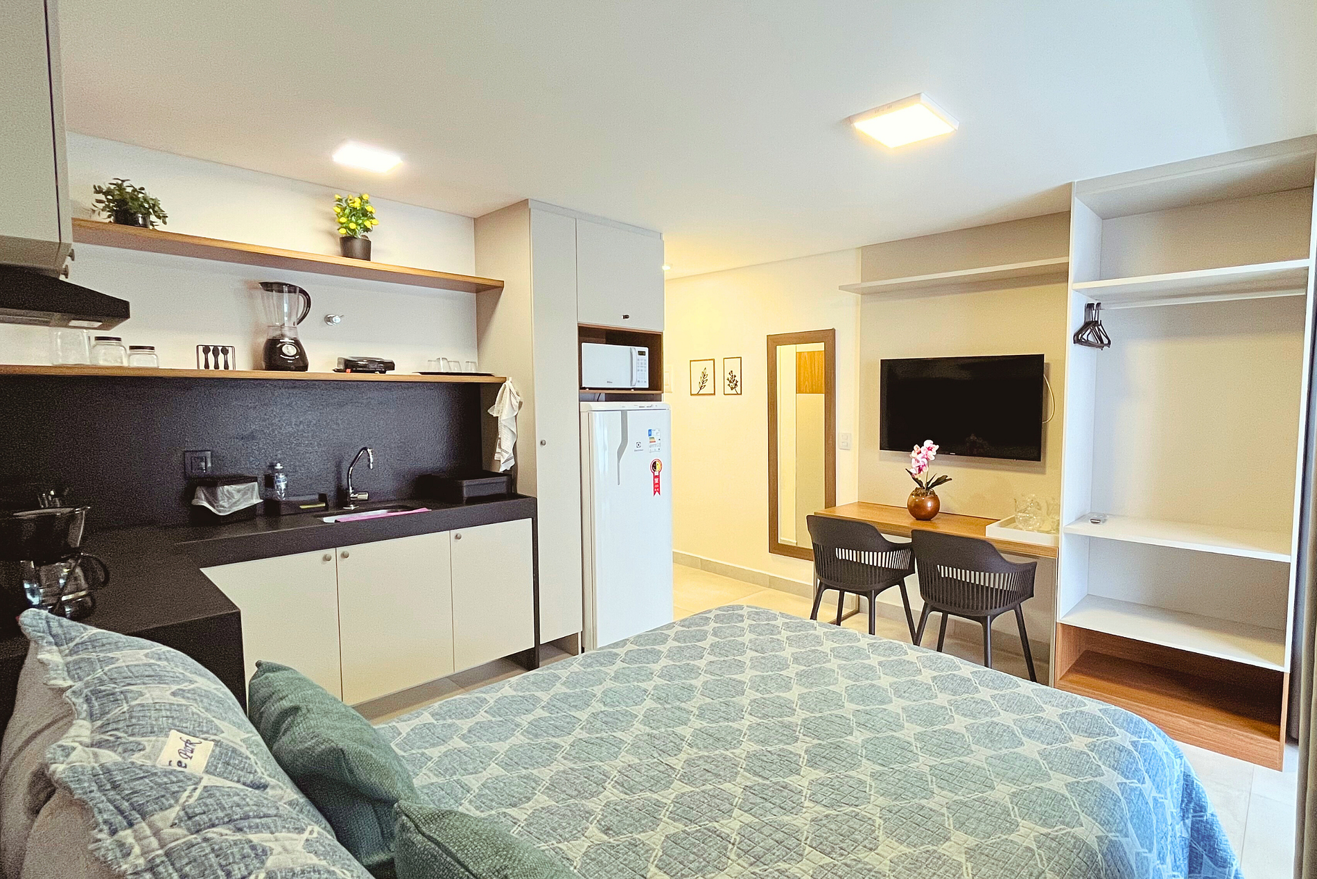Living ofrece ropa de cama y baño, así como algunos amenities de cortesía. El flat cuenta con aire acondicionado, Smart TV, mesa y sillas para las comidas. La cocina está equipada con utensilios para la preparación de alimentos, como sandwichera, encimera, ollas y cafetera. Además, el apartamento dispone de secador de pelo y plancha.
