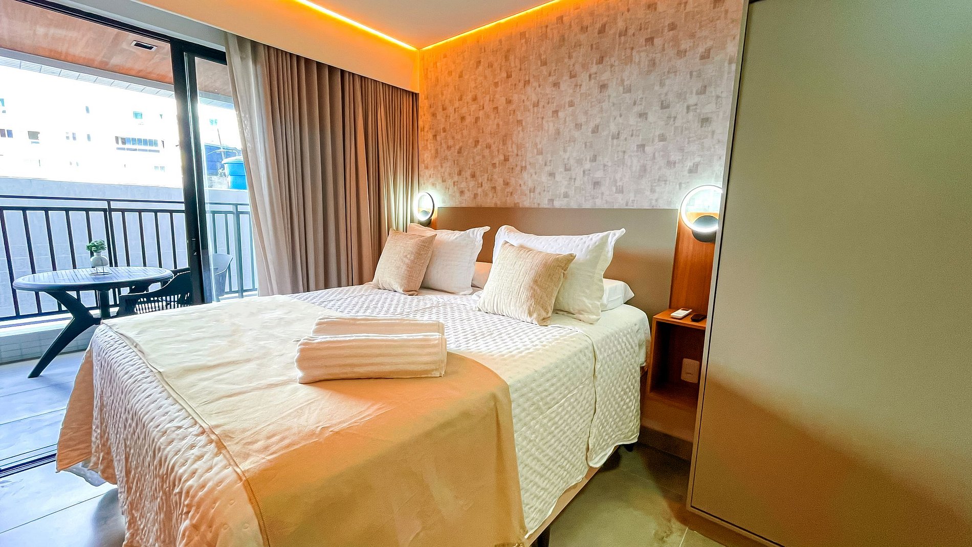 Nuestro Flat Studio c/ varanda #1 - by Living acomoda a 2 personas con una cama tamaño queen Cuenta con una cocina compacta equipada con cooktop, microondas, cafetera, sandwichera, minibar y algunos utensilios para cocinar. El edificio ofrece piscina en la azotea, gimnasio y lavandería. Está ubicado cerca de restaurantes, farmacias, panaderías, gasolineras y pequeños mercados. También dispone de aire acondicionado y Smart TV para una estadía más cómoda.