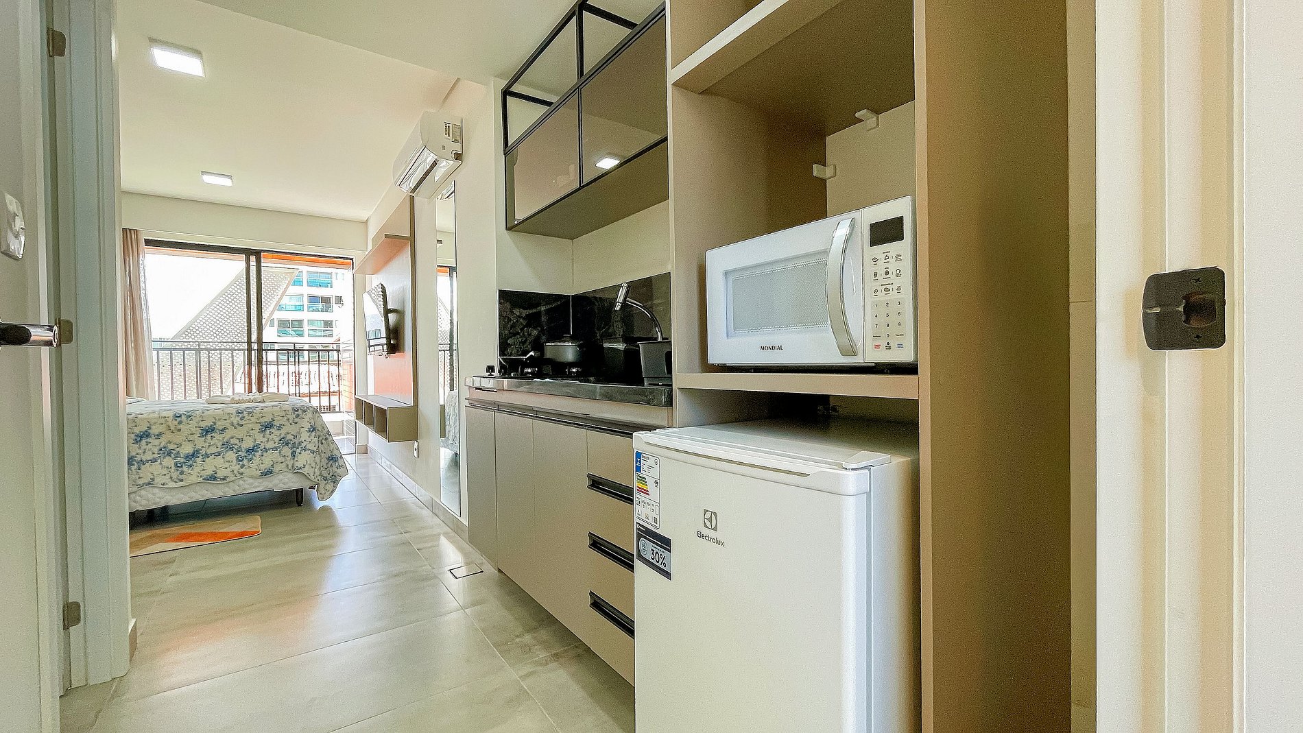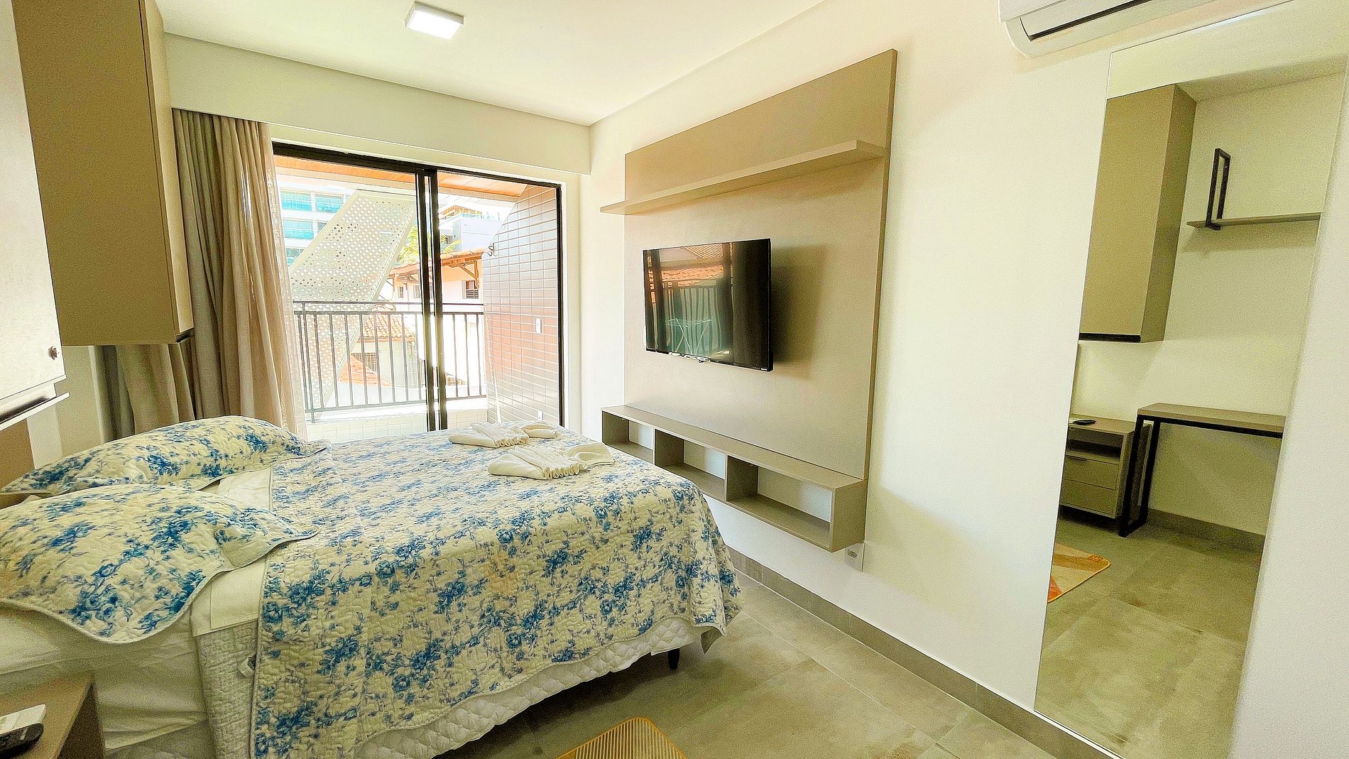 O Flat Studio c/ Varanda #5 acomoda 02 pessoas com cama casal, ar-condicionado 9.000 btus e Smart TV. A cozinha é compacta, com cooktop, micro-ondas, cafeteira, sanduicheira, frigobar e utensílios para refeições rápidas. O prédio conta com piscina na cobertura, academia, lavanderia e garagem rotativa. Condomínio excelente de frente para o mar, locazilação perto de restaurantes, padarias, postos e mercadinhos. Conforto e praticidade para sua estadia!