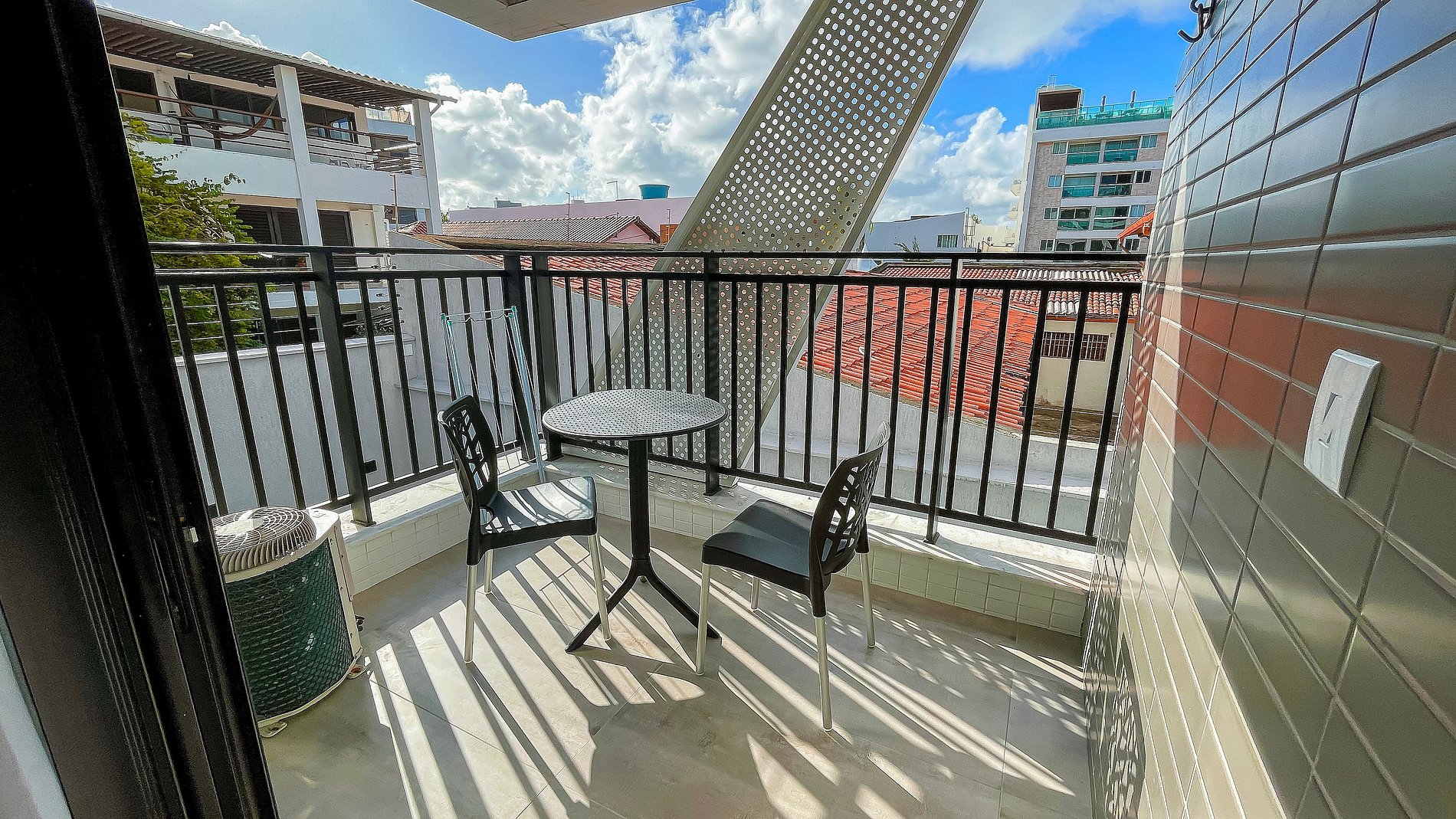 O Flat Studio c/ Varanda #5 acomoda 02 pessoas com cama casal, ar-condicionado 9.000 btus e Smart TV. A cozinha é compacta, com cooktop, micro-ondas, cafeteira, sanduicheira, frigobar e utensílios para refeições rápidas. O prédio conta com piscina na cobertura, academia, lavanderia e garagem rotativa. Condomínio excelente de frente para o mar, locazilação perto de restaurantes, padarias, postos e mercadinhos. Conforto e praticidade para sua estadia!
