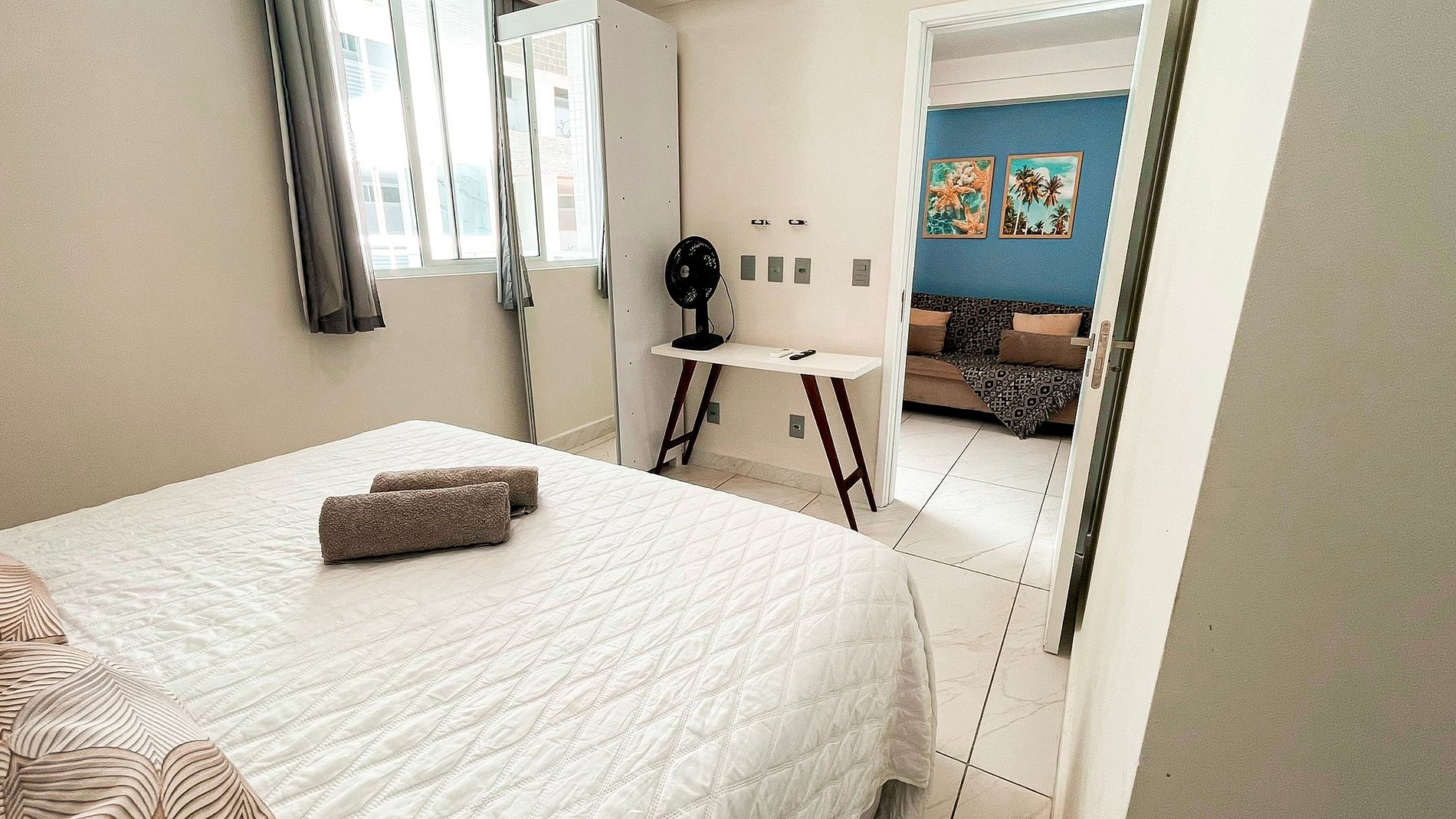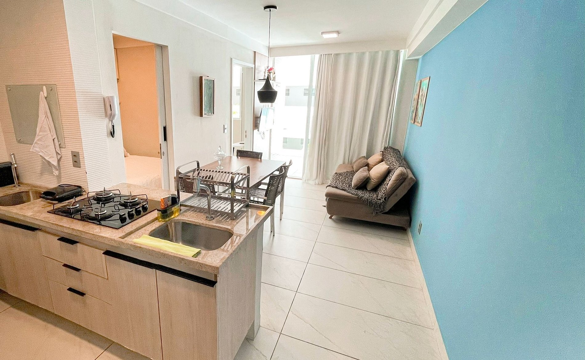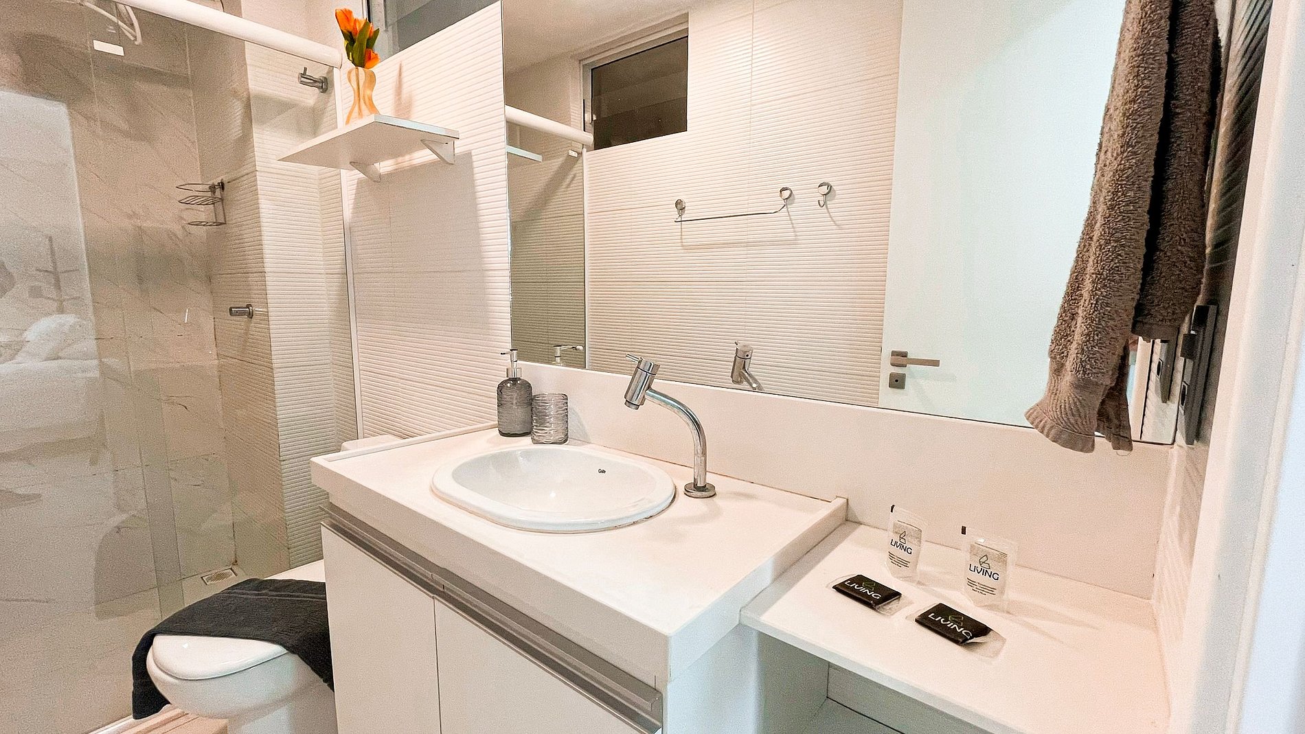 A Living disponibiliza enxoval de cama e banho, bem como alguns amenities como cortesia. No flat, as suítes possuem ar-condicionado e armários; a sala dispõe de sofá, televisão, mesa e cadeiras para refeições. Na cozinha, encontram-se alguns utensílios para preparo de refeições, como liquidificador, sanduicheira, cooktop, panelas e cafeteira. O prédio conta com piscina aquecida, garagem gratuita (uma vaga por apartamento) e lavanderia da OMO, que pode ser utilizada pelos hóspedes mediante pagamento pelo uso da máquina. Fornecemos berço, mediante disponibilidade.