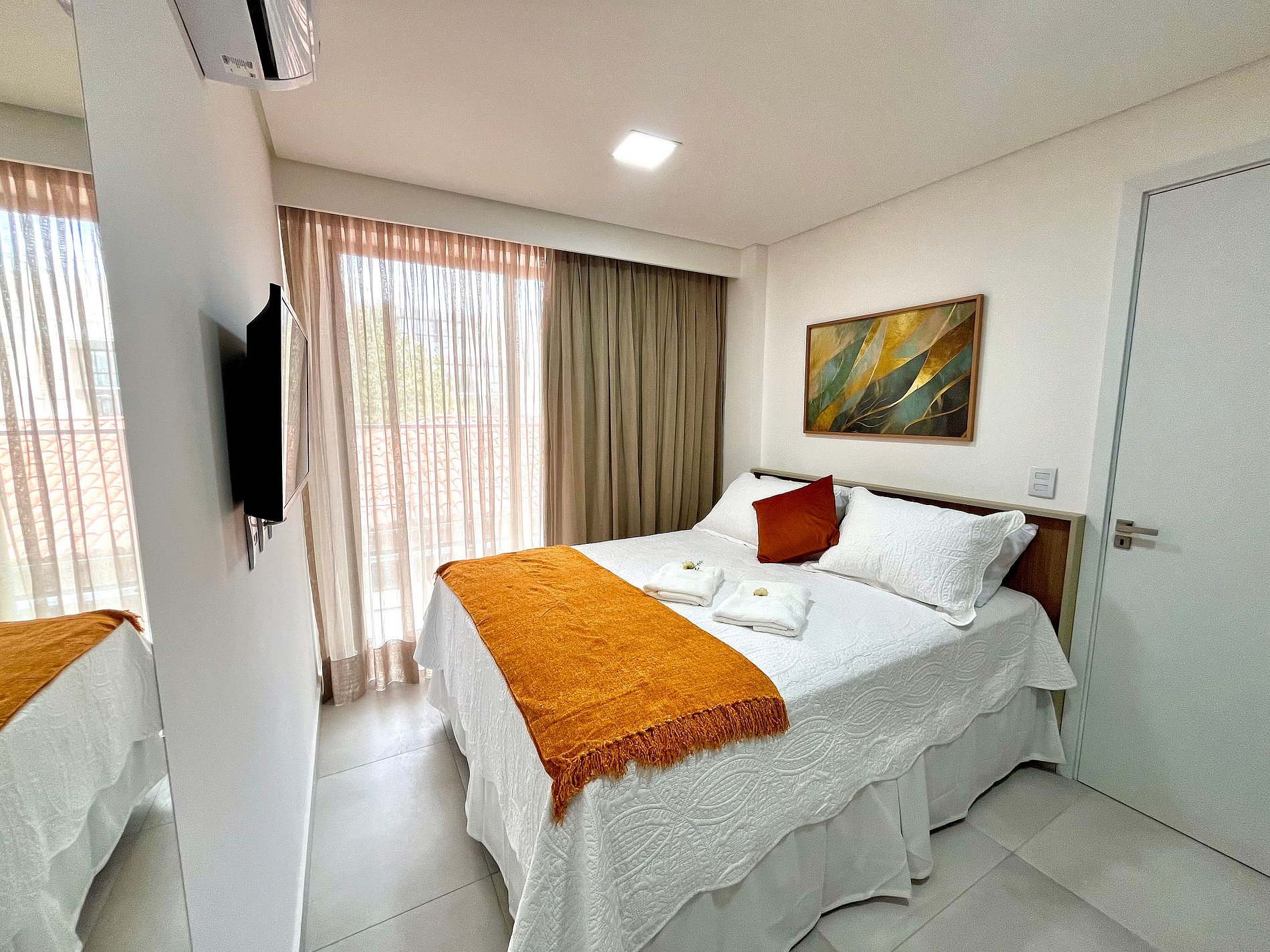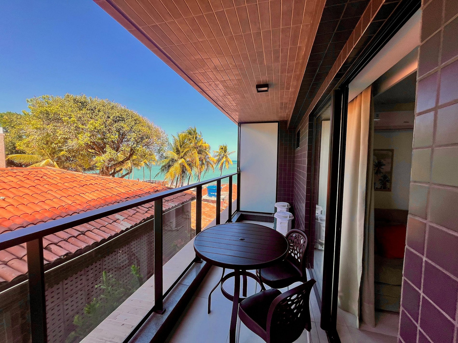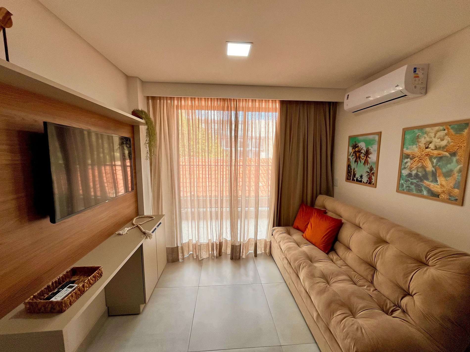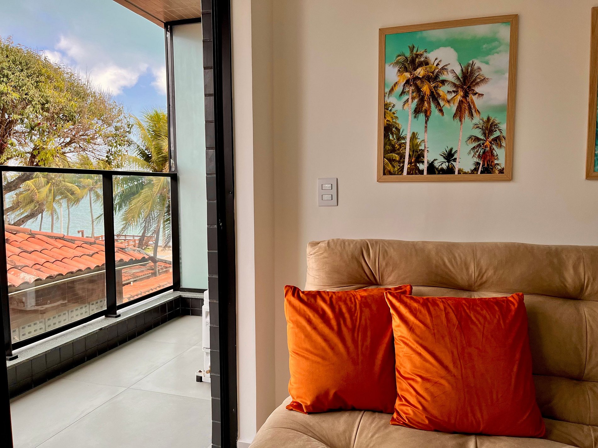 Flat com 43m², capacidade para acomodar até 03 pessoas, contando com uma cama queen e um sofá cama. Possui umavaranda lateral para o mar com mesa e cadeiras, cozinha equipada com cooktop, micro-ondas, cafeteira, sanduicheira, geladeira entre outros itens.Conta com Smart TV, ar condicionado, espaço para refeições. O prédio conta com piscina na cobertura, coworking, academia e lavanderia. Fica próximo a restaurantes, farmácias, padarias, posto de gasolina e conveniências.