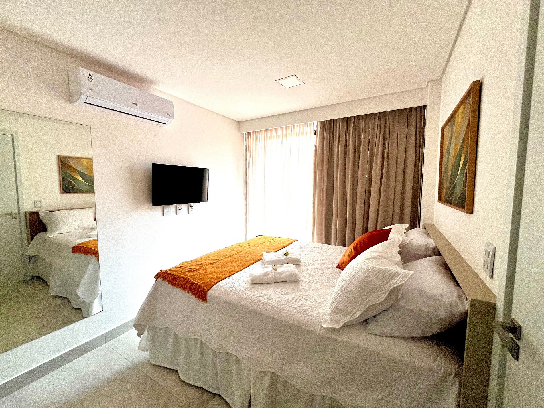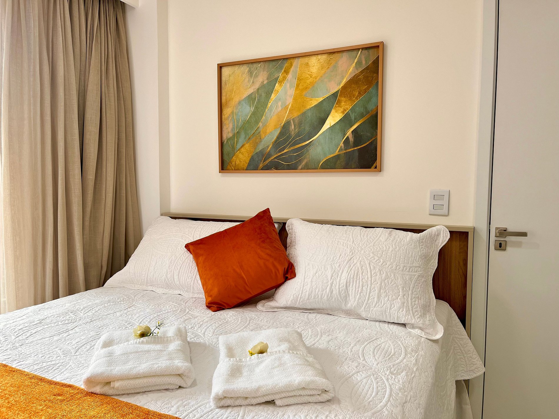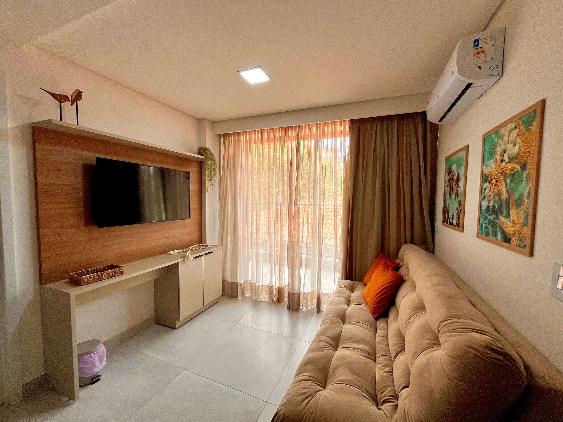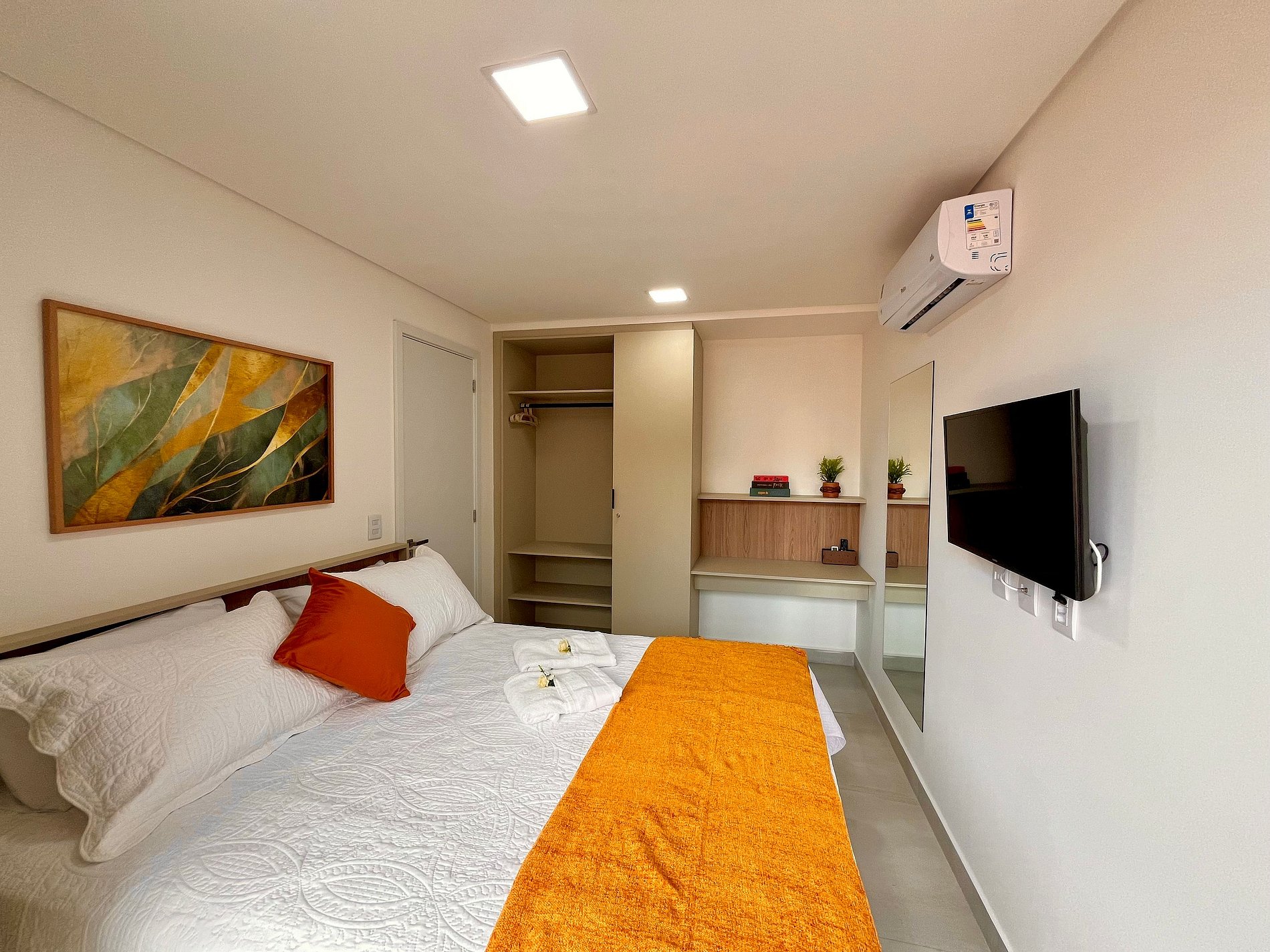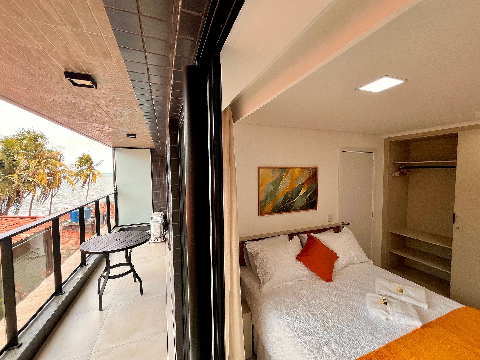 Flat com 43m², capacidade para acomodar até 03 pessoas, contando com uma cama queen e um sofá cama. Possui umavaranda lateral para o mar com mesa e cadeiras, cozinha equipada com cooktop, micro-ondas, cafeteira, sanduicheira, geladeira entre outros itens.Conta com Smart TV, ar condicionado, espaço para refeições. O prédio conta com piscina na cobertura, coworking, academia e lavanderia. Fica próximo a restaurantes, farmácias, padarias, posto de gasolina e conveniências.