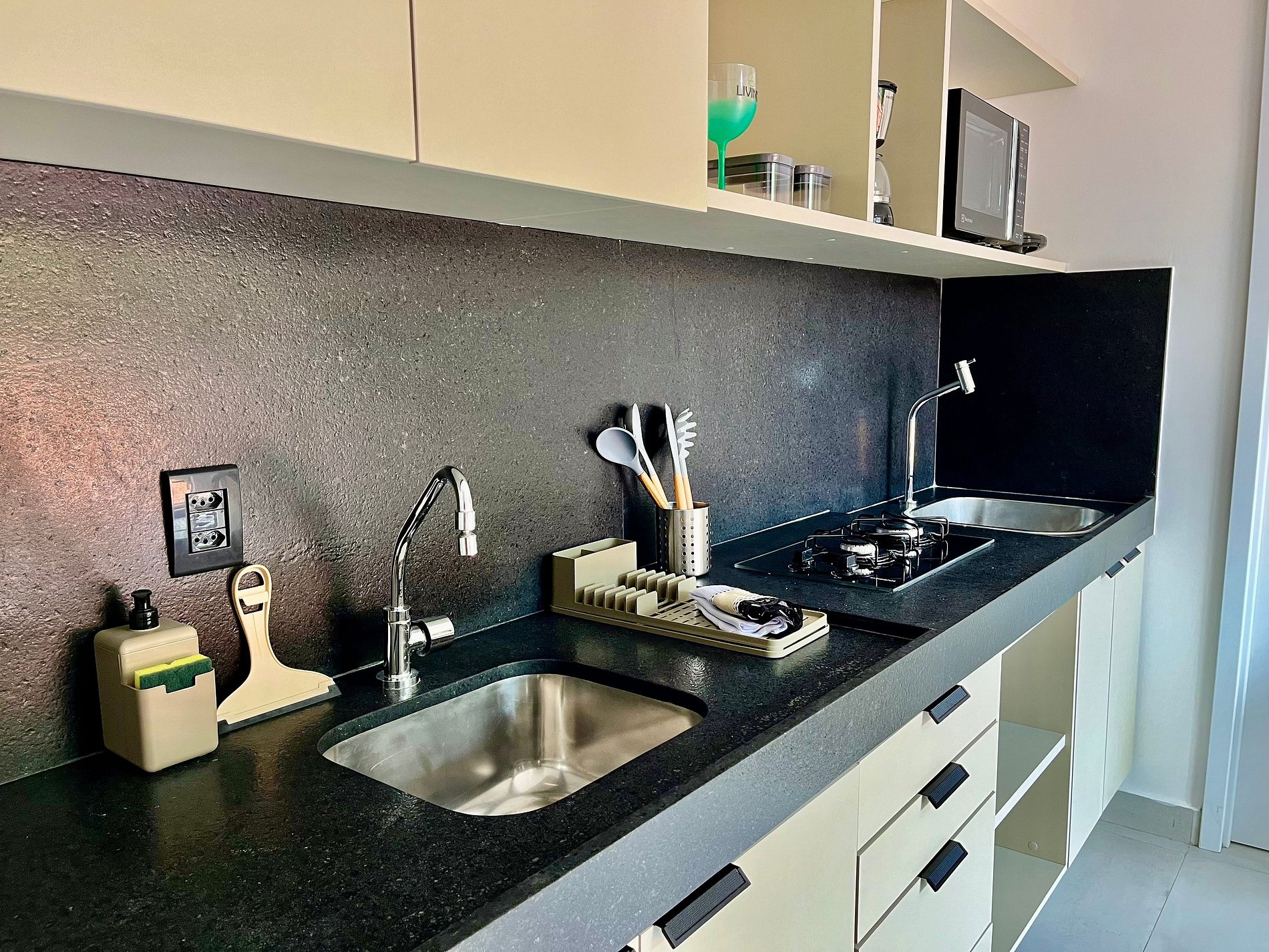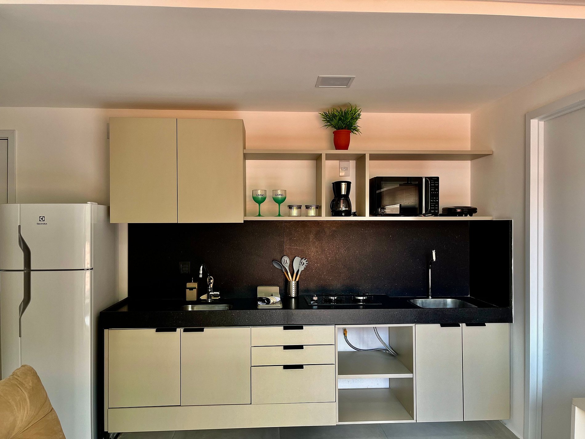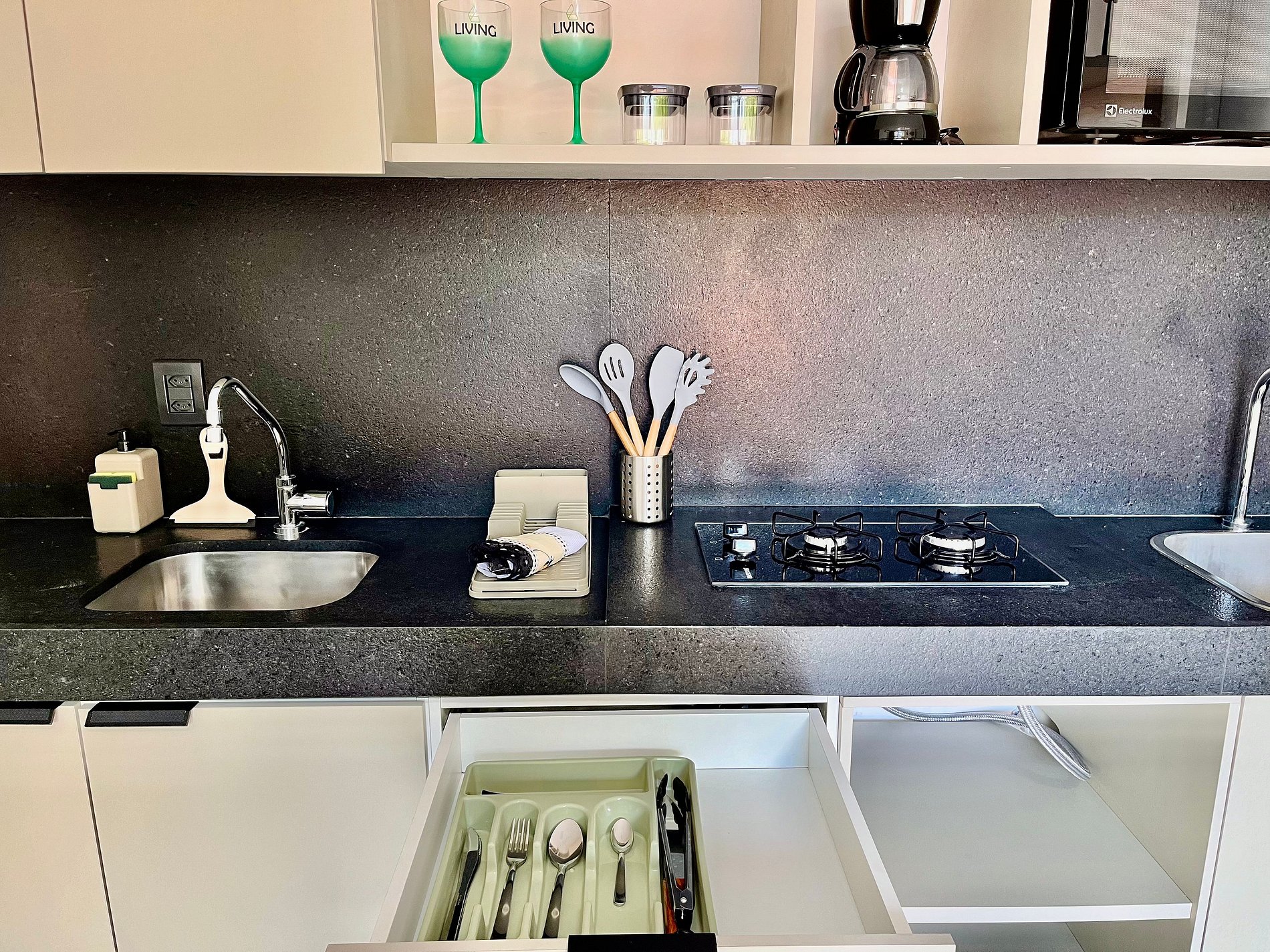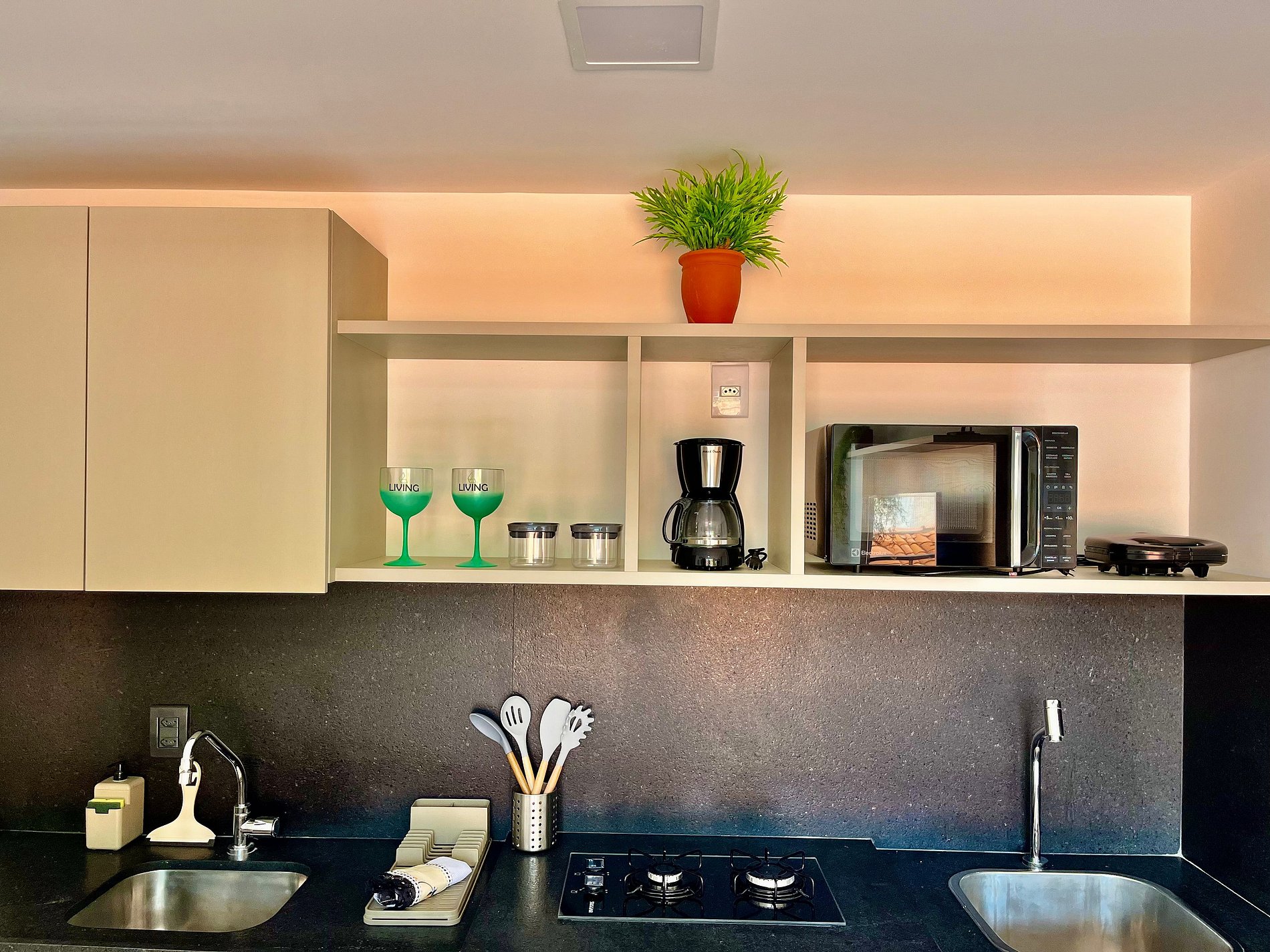 A Living disponibiliza enxoval de cama e banho, bem como alguns amenities como cortesia. O flat possui ar-condicionado, Smart Tv, mesa e cadeiras para refeições. Na cozinha, encontram-se alguns utensílios para preparo de refeições, como sanduicheira, cooktop, panelas e cafeteira. Além disso, o apartamento conta com secador de cabelo. O prédio oferece piscina, caiaques e pranchas, coworking e lavanderia, que pode ser utilizada pelos hóspedes mediante pagamento pelo uso da máquina. Fornecemos berço e cadeiras de praia, também sujeitos à disponibilidade.