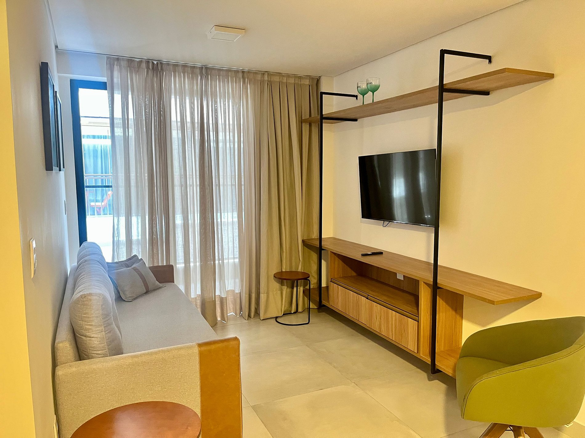 A Living disponibiliza enxoval de cama e banho, bem como alguns amenities como cortesia. O flat possui ar-condicionado nos quartos e armários; a sala dispõe de sofá-cama, televisão, e na varanda mesa e cadeiras para refeições. Na cozinha, encontram-se alguns utensílios para preparo de refeições, como sanduicheira, cooktop, panelas e cafeteira. Além disso, o apartamento conta com secador de cabelo e o ferro de passar está sujeito à disponibilidade. O prédio oferece piscina, caiaques e pranchas, coworking e lavanderia, que pode ser utilizada pelos hóspedes mediante pagamento pelo uso da máquina. Fornecemos berço e cadeiras de praia, também sujeitos à disponibilidade.