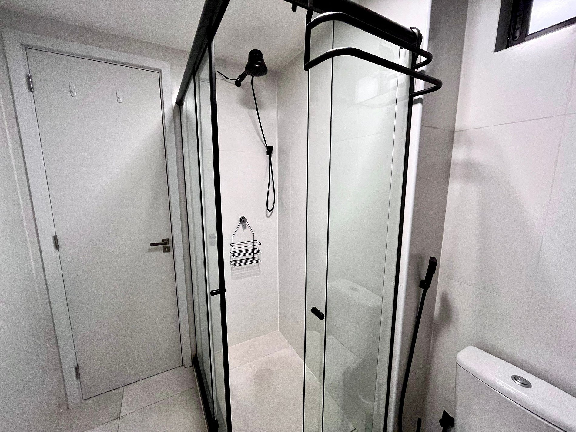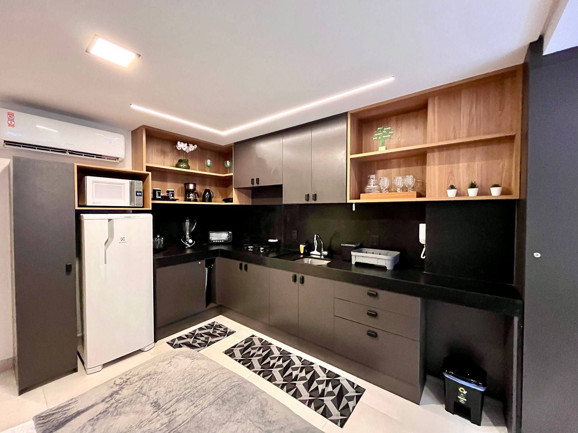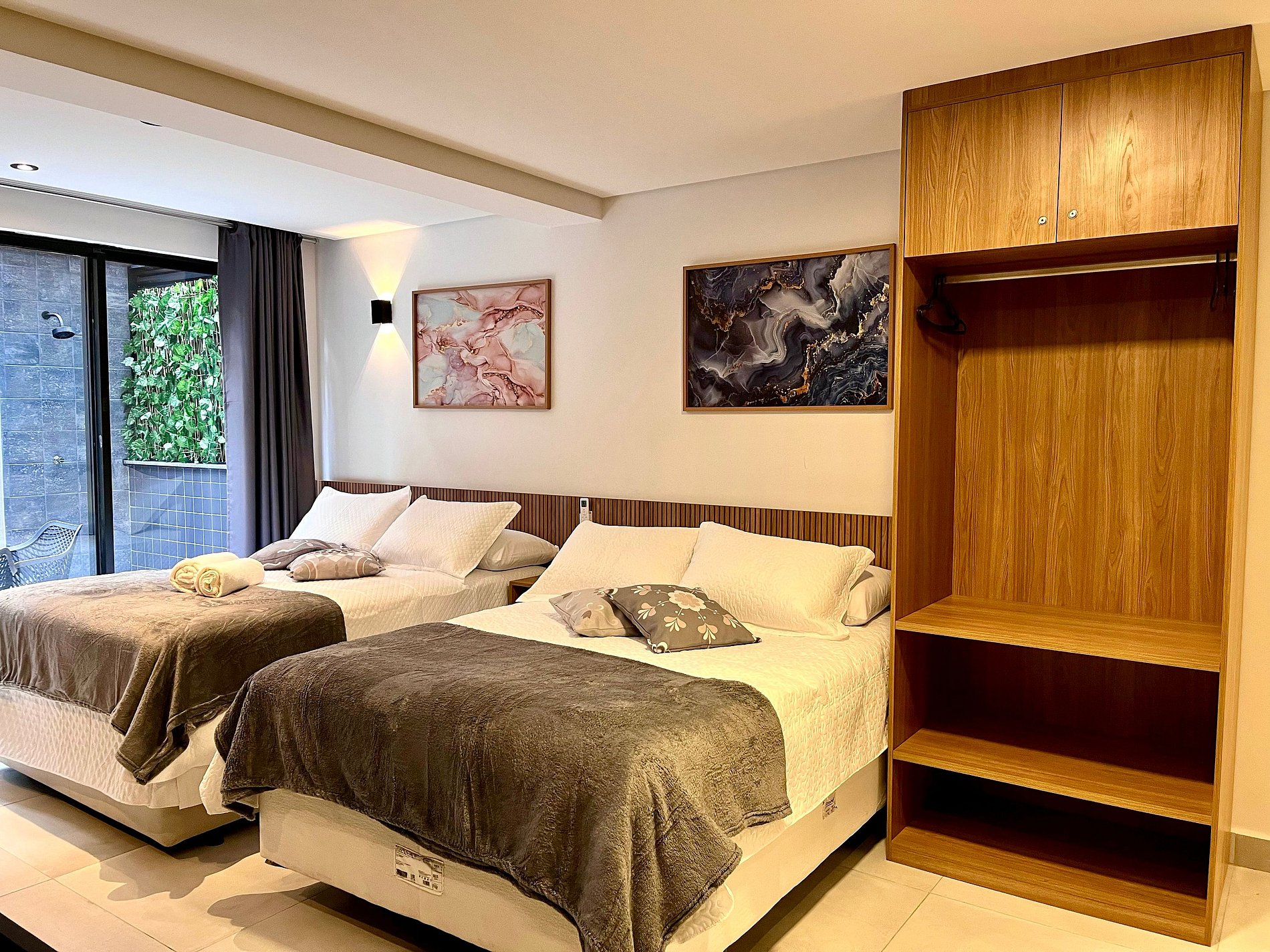 Flat com 37m², capacidade para acomodar até 04 pessoas, contando com duas camas casais. Possui uma área externa com mesa e cadeiras e chuveiro externo, cozinha equipada com cooktop, micro-ondas, cafeteira, sanduicheira, frigobar entre outros itens.Conta com Smart TV, ar condicionado, espaço para trabalho. O prédio conta com piscina na cobertura, coworking, academia e lavanderia. Fica próximo a restaurantes, farmácias, padarias, posto de gasolina e conveniências.