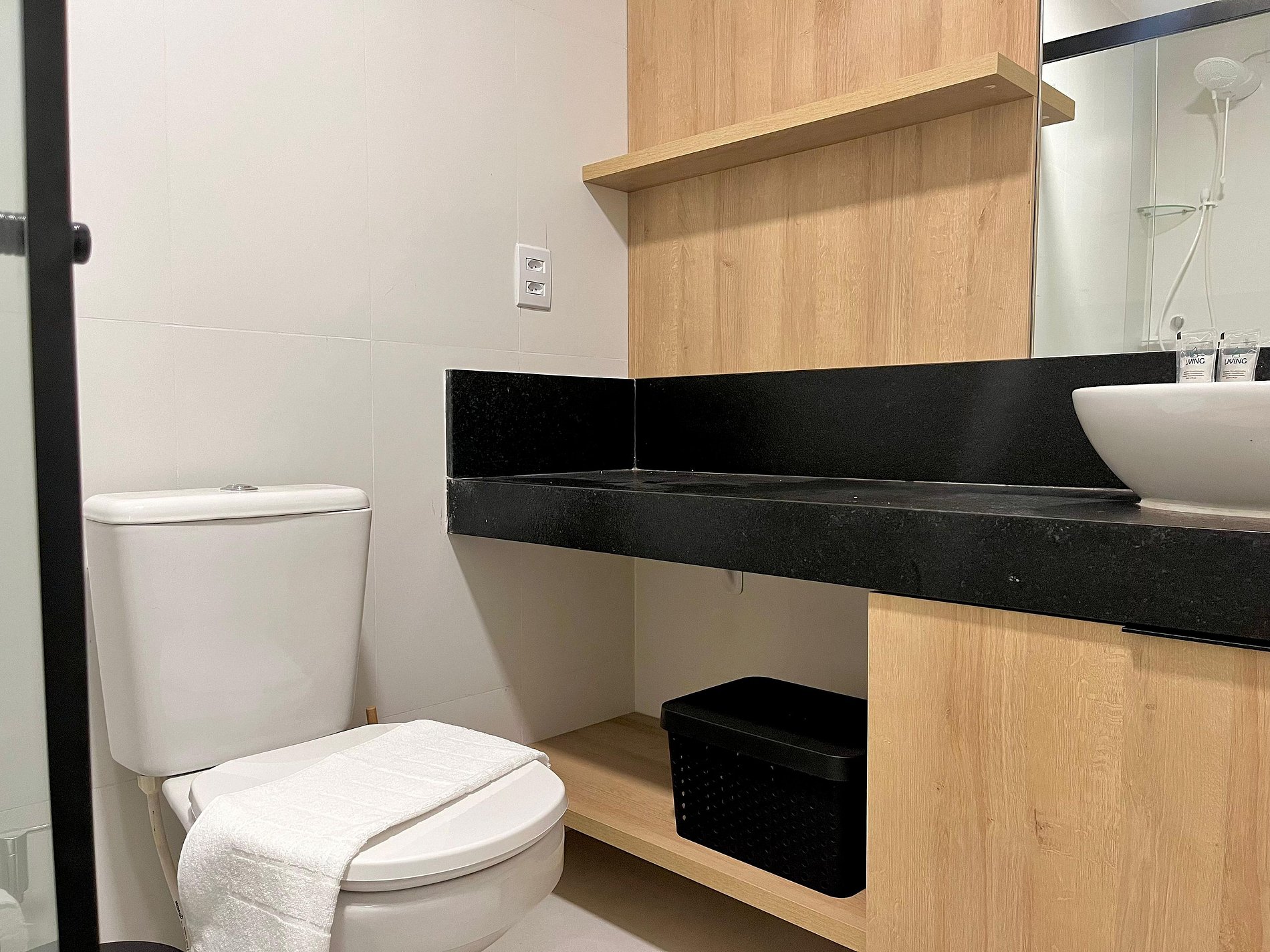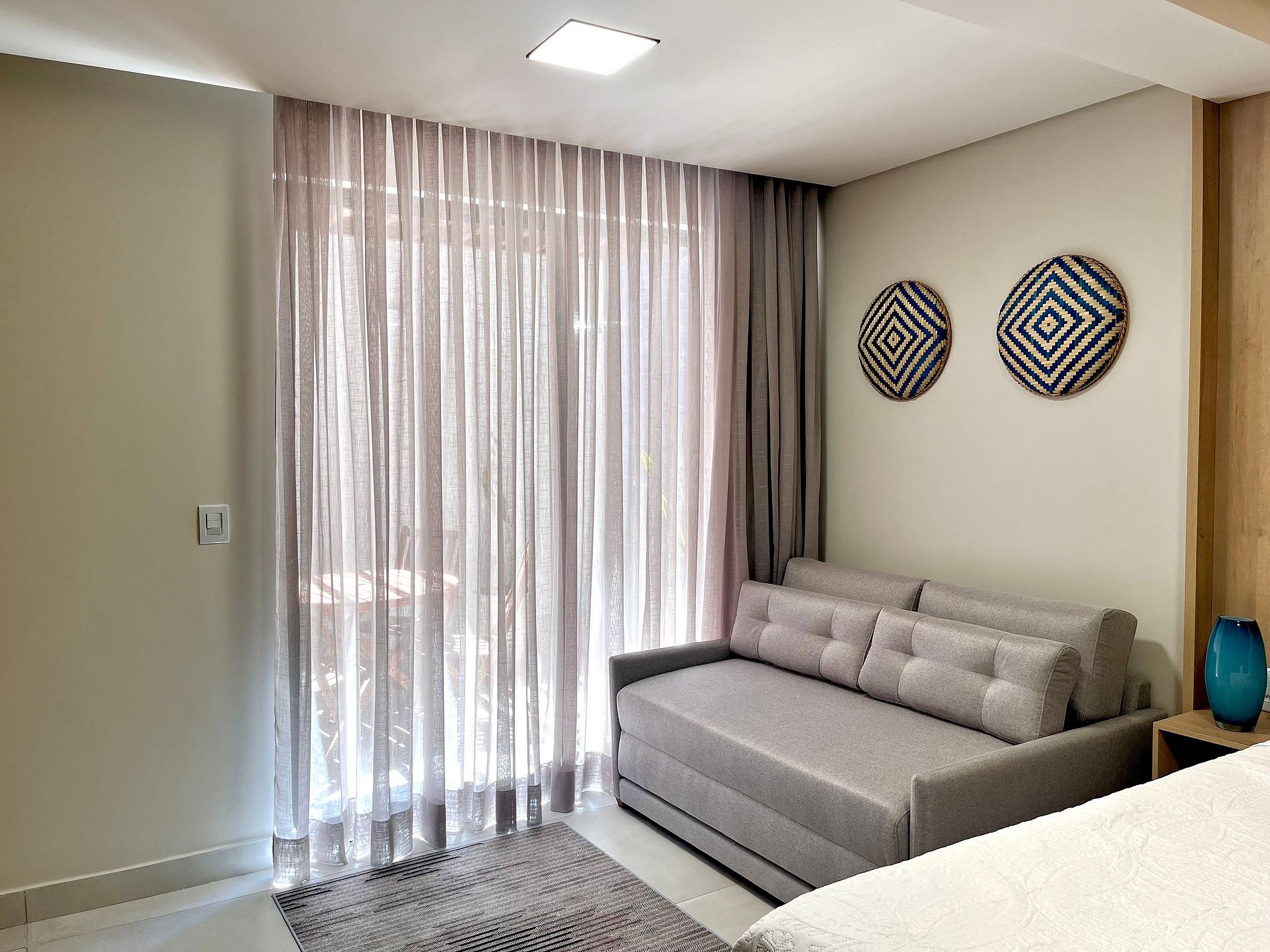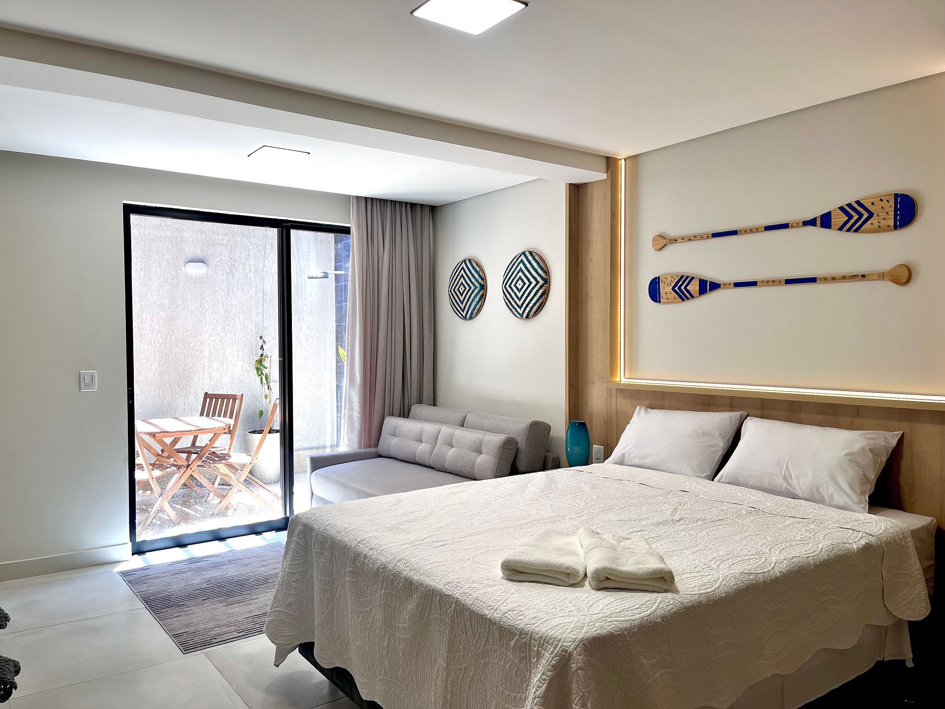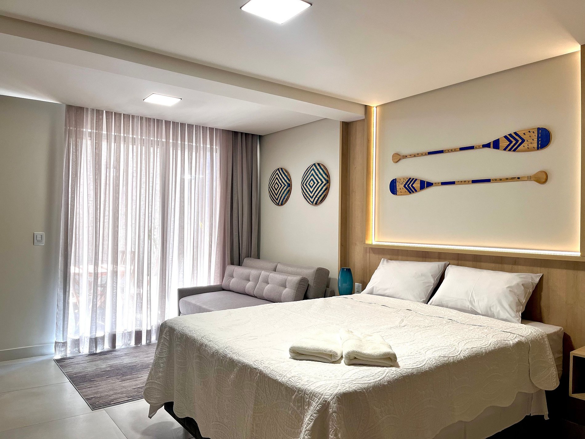 A Living disponibiliza enxoval de cama e banho, bem como alguns amenities como cortesia. O flat possui ar-condicionado, Smart Tv, mesa e cadeiras para refeições. Na cozinha, encontram-se alguns utensílios para preparo de refeições, como sanduicheira, cooktop, panelas e cafeteira. Além disso, o apartamento conta com secador de cabelo e ferro de passar. O prédio oferece piscina, caiaques e pranchas, coworking e lavanderia, que pode ser utilizada pelos hóspedes mediante pagamento pelo uso da máquina. Fornecemos berço e cadeiras de praia, também sujeitos à disponibilidade.