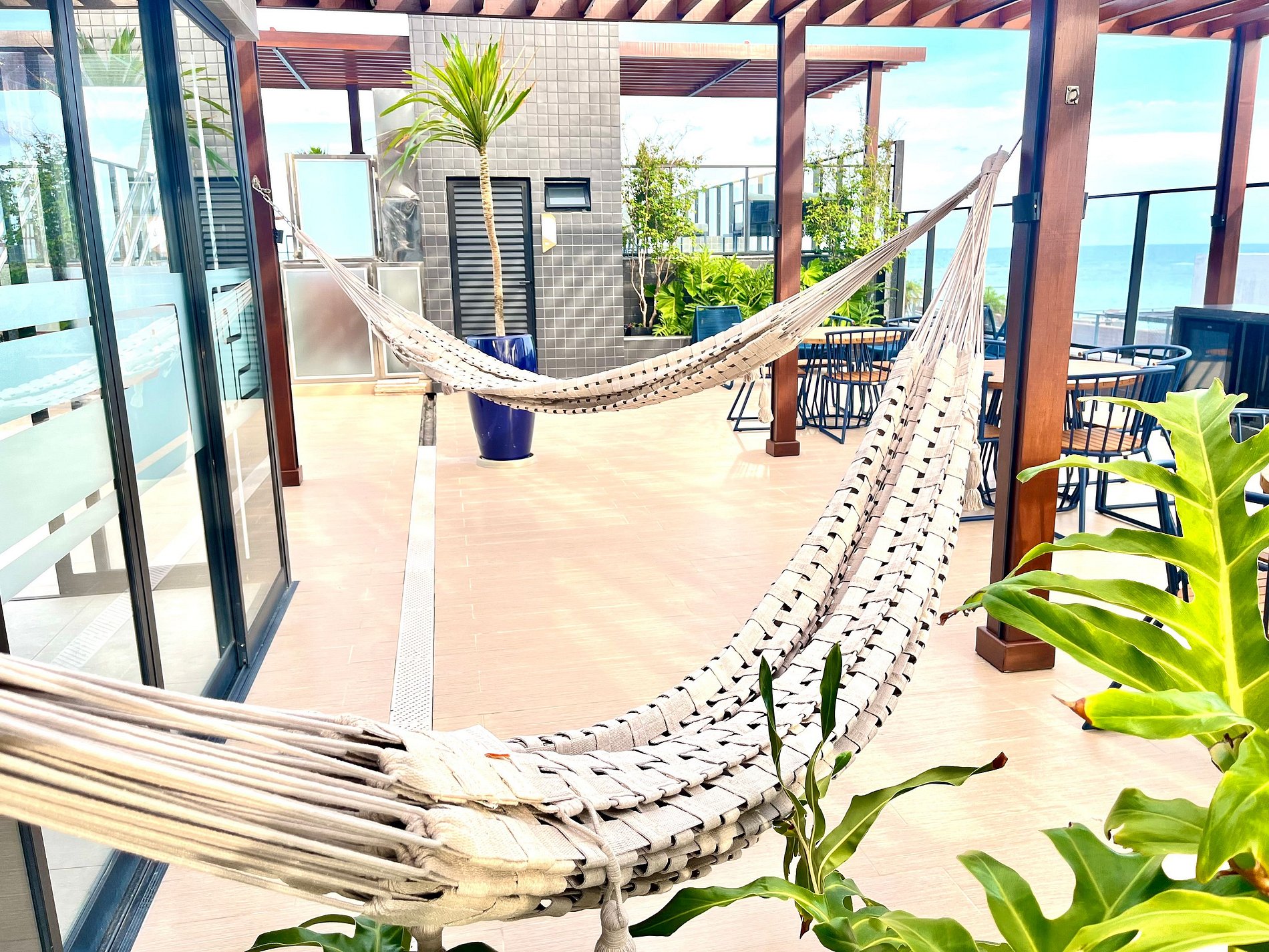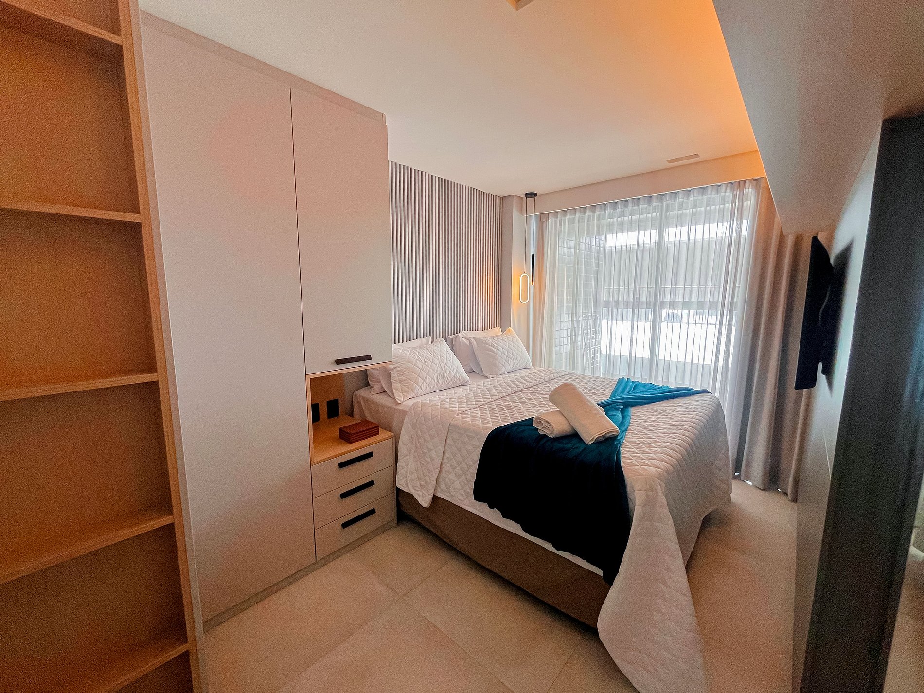 Conta com uma piscina de borda infinita na cobertura com vista direta para o mar, academia completa para manter a rotina em dia, além de espaço de coworking para você que trabalha remoto. O condomínio conta com uma guarderia que dispõe máquina de gelo, caiaques, pranchas e bebedouro de água que os hóspedes podem usufruir. Dispõe também lavanderia proporcionando ainda mais praticidade durante a estada.