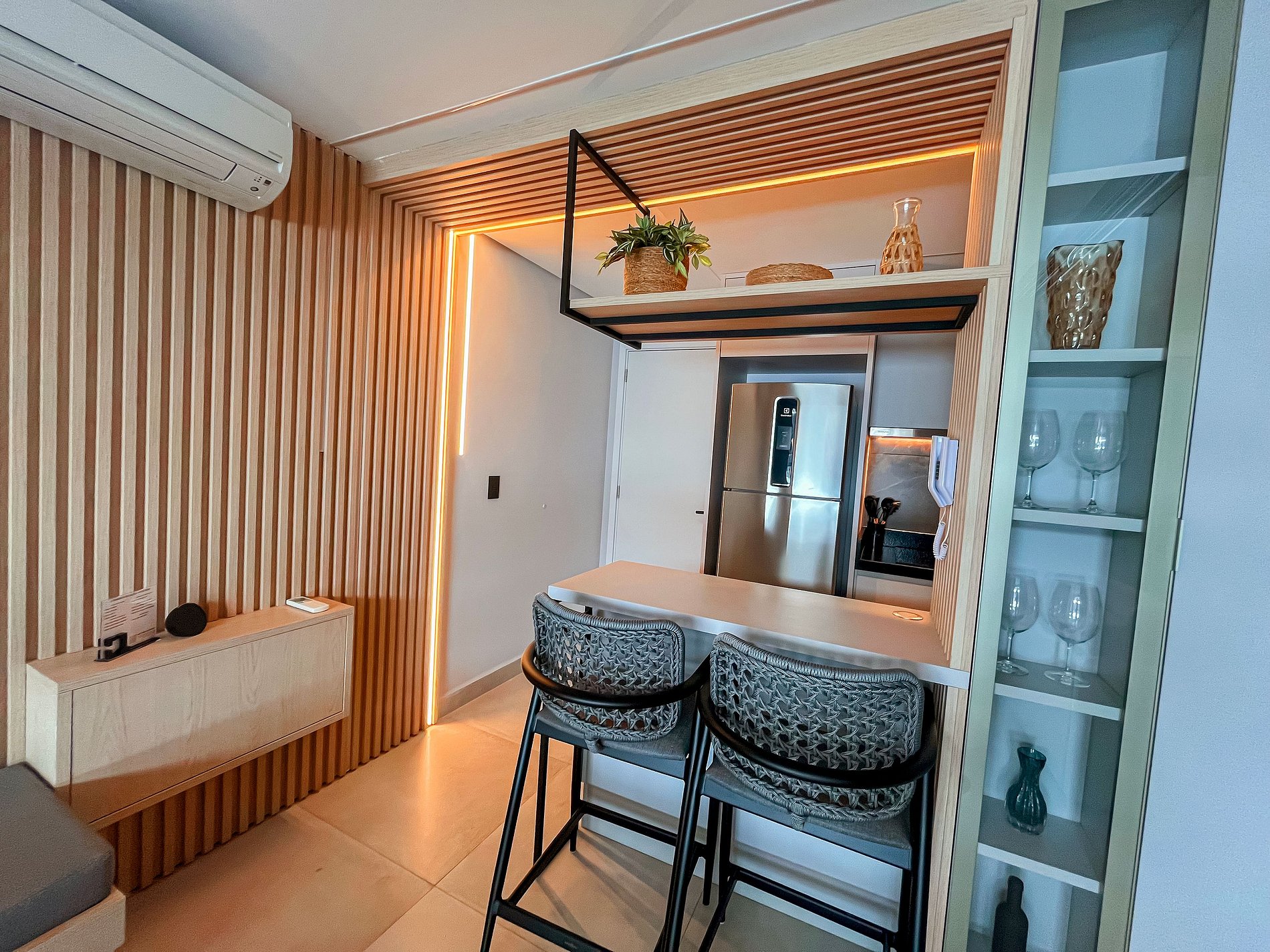 A Living disponibiliza enxoval de cama e banho, bem como alguns amenities como cortesia. O flat possui ar-condicionado e armários; a sala dispõe de sofá-cama, televisão, mesa e cadeiras para refeições. Na cozinha, encontram-se utensílios para preparo de refeições, como sanduicheira, cooktop, panelas e cafeteira. Além disso, o apartamento conta com secador de cabelo, caixas de som e Alexa. O prédio oferece piscina, caiaques, pranchas, coworking e lavanderia, este último pode ser utilizada pelos hóspedes mediante pagamento pelo uso da máquina. Fornecemos berço, cadeiras de praia e ferro de passar mediante solicitação e disponibilidade do item.