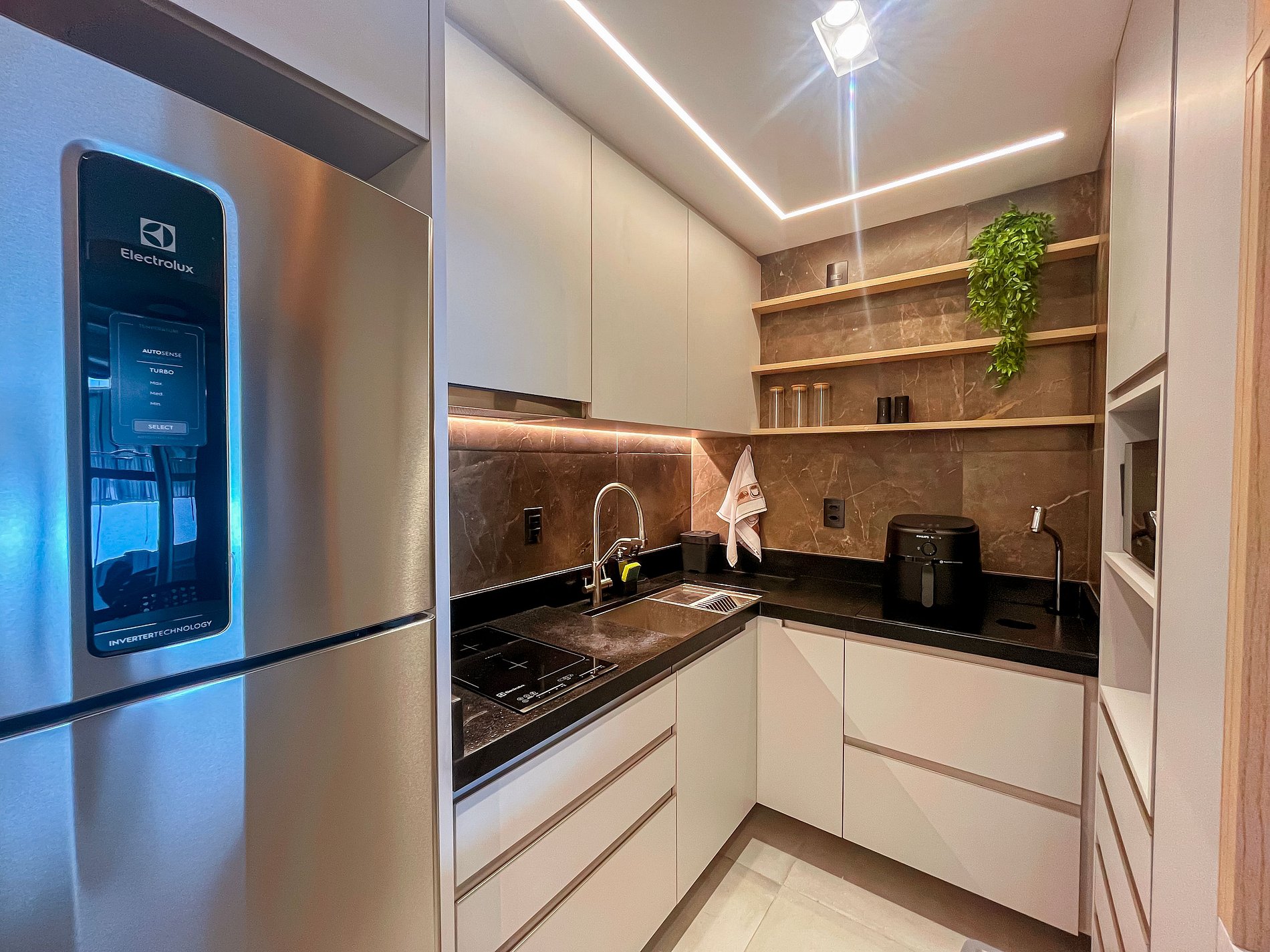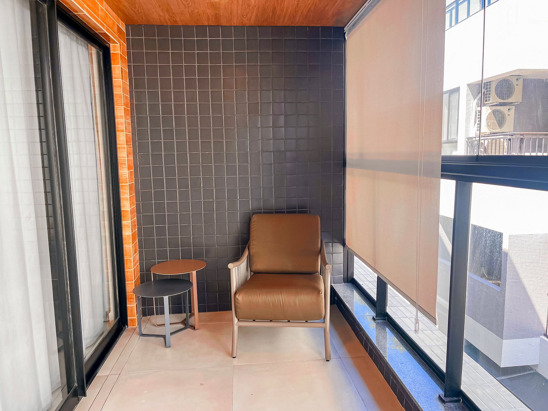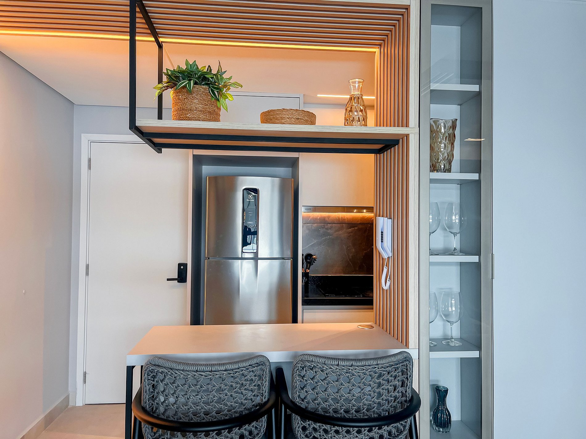 Flat com garagem e capacidade para acomodar até 03 pessoas confortavelmente, com cama queen e sofá-cama, tecnológico com integração via ALEXA nas luzes e ares condicionado. Possui varanda lateral e cozinha equipada com cooktop, micro-ondas, cafeteira, sanduicheira, geladeira e utensílios para cozinhar. O prédio conta com piscina na cobertura, coworking, academia e lavanderia. Fica próximo a restaurantes, farmácias, padaria, posto de gasolina e conveniências.