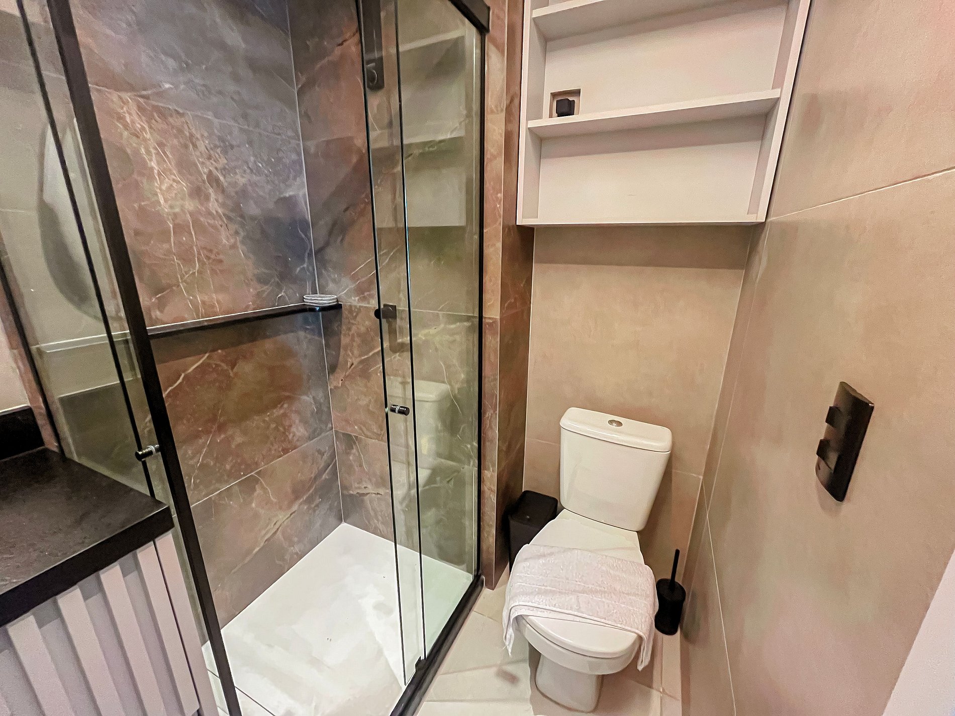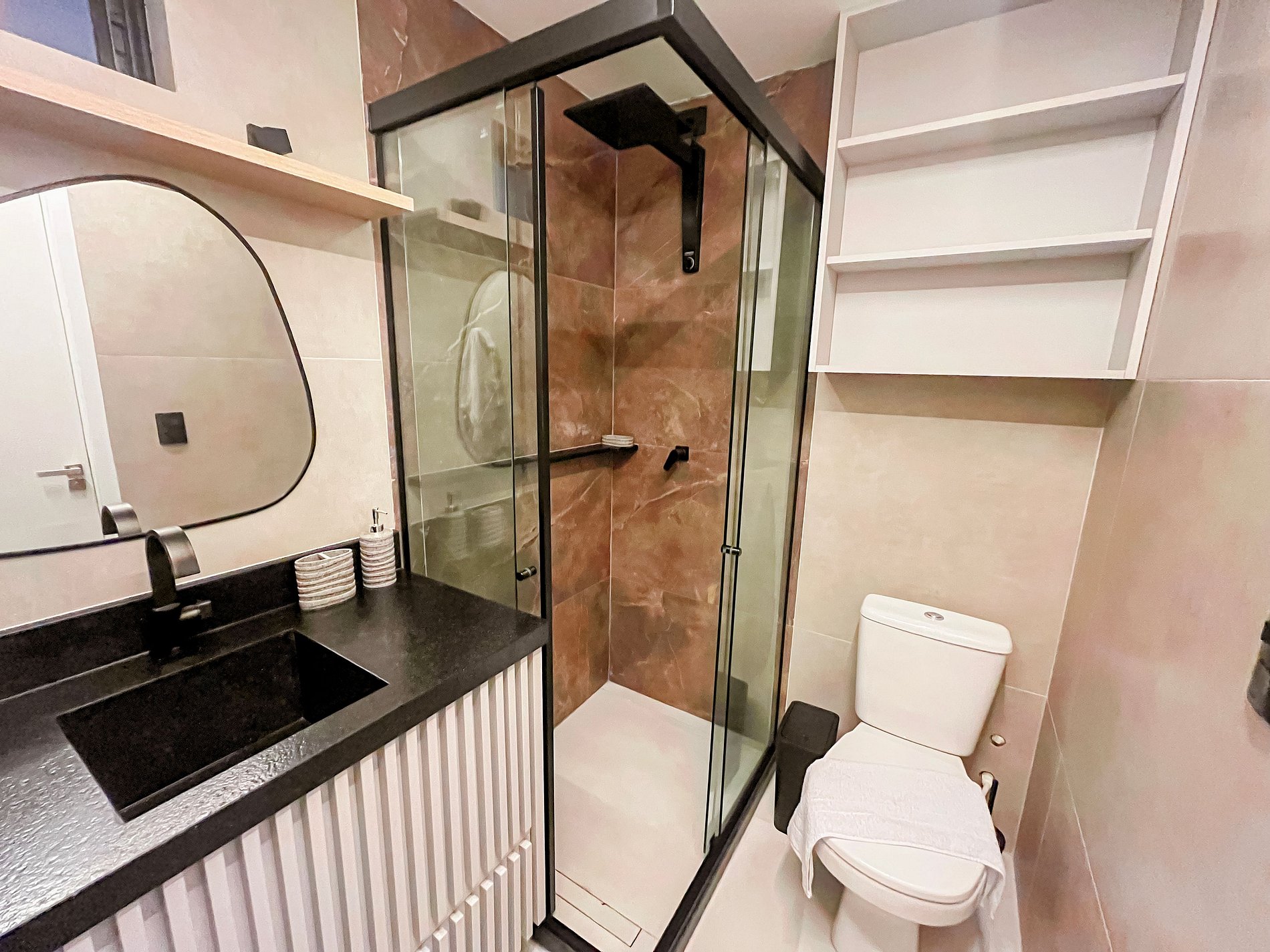 Flat com garagem e capacidade para acomodar até 03 pessoas confortavelmente, com cama queen e sofá-cama, tecnológico com integração via ALEXA nas luzes e ares condicionado. Possui varanda lateral e cozinha equipada com cooktop, micro-ondas, cafeteira, sanduicheira, geladeira e utensílios para cozinhar. O prédio conta com piscina na cobertura, coworking, academia e lavanderia. Fica próximo a restaurantes, farmácias, padaria, posto de gasolina e conveniências.