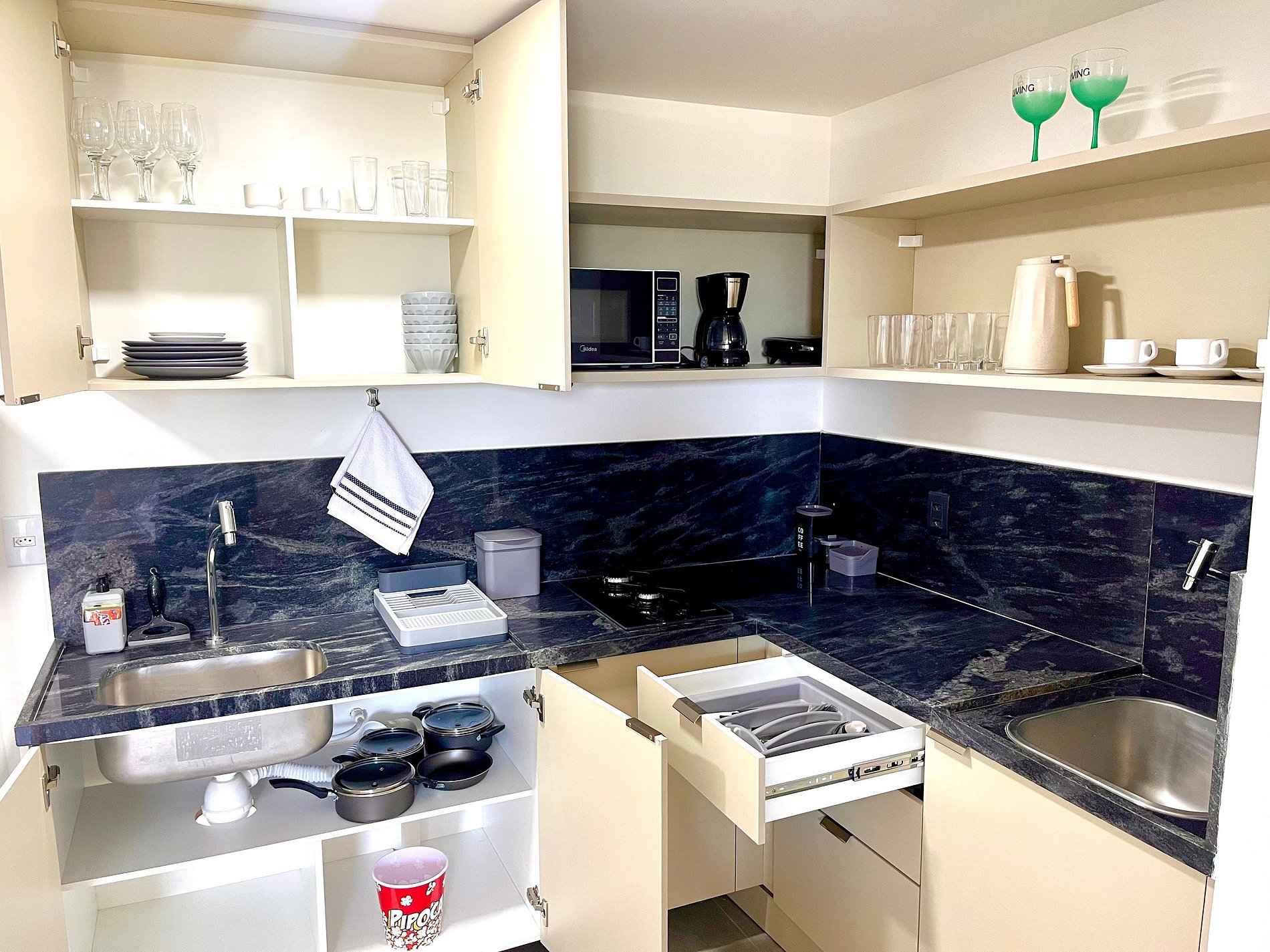 Nossas acomodações são bastante aconchegantes, proporcionando a sensação de estar em casa. Trata-se de um apartamento completo, adequado para estadias prolongadas, garantindo o máximo de conforto.