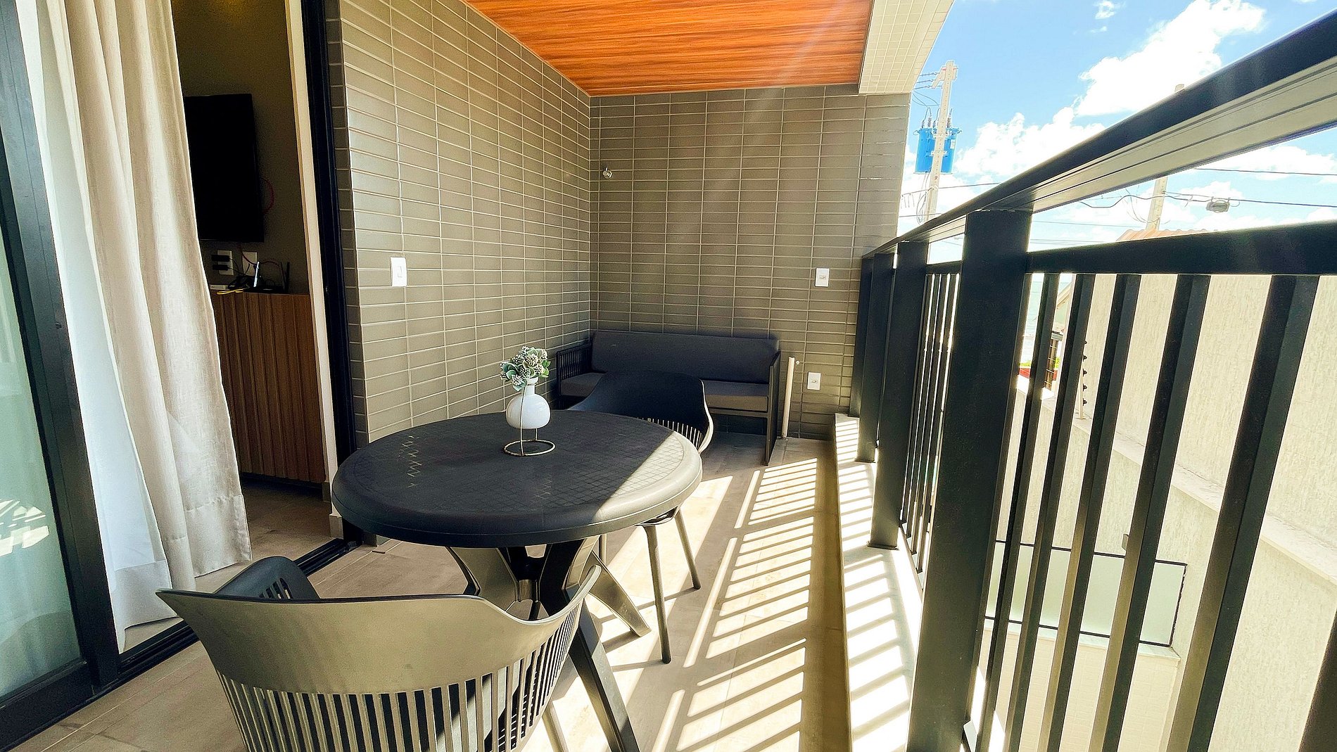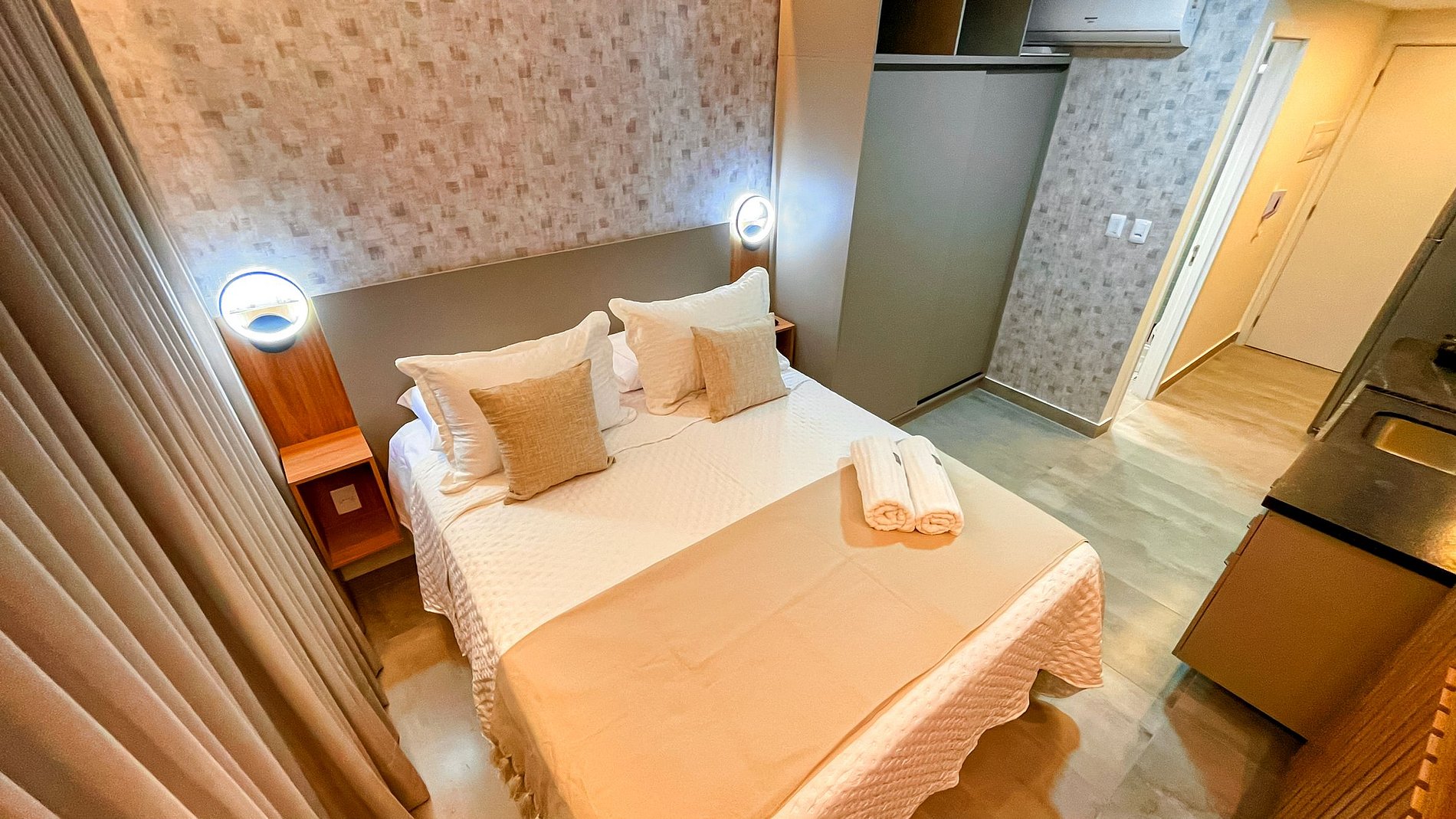 O Flat Studio c/ varanda #1 - by Living acomoda 02 pessoas com cama queen, ar-condicionado e Smart TV. A cozinha é compacta com cooktop, micro-ondas, cafeteira, sanduicheira, frigobar e utensílios para refeições rápidas. O prédio conta com piscina na cobertura, academia, lavanderia e garagem rotativa. Condomínio excelente de frente para o mar, locazilação perto de restaurantes, padarias, postos e mercadinhos. Conforto e praticidade para sua estadia!