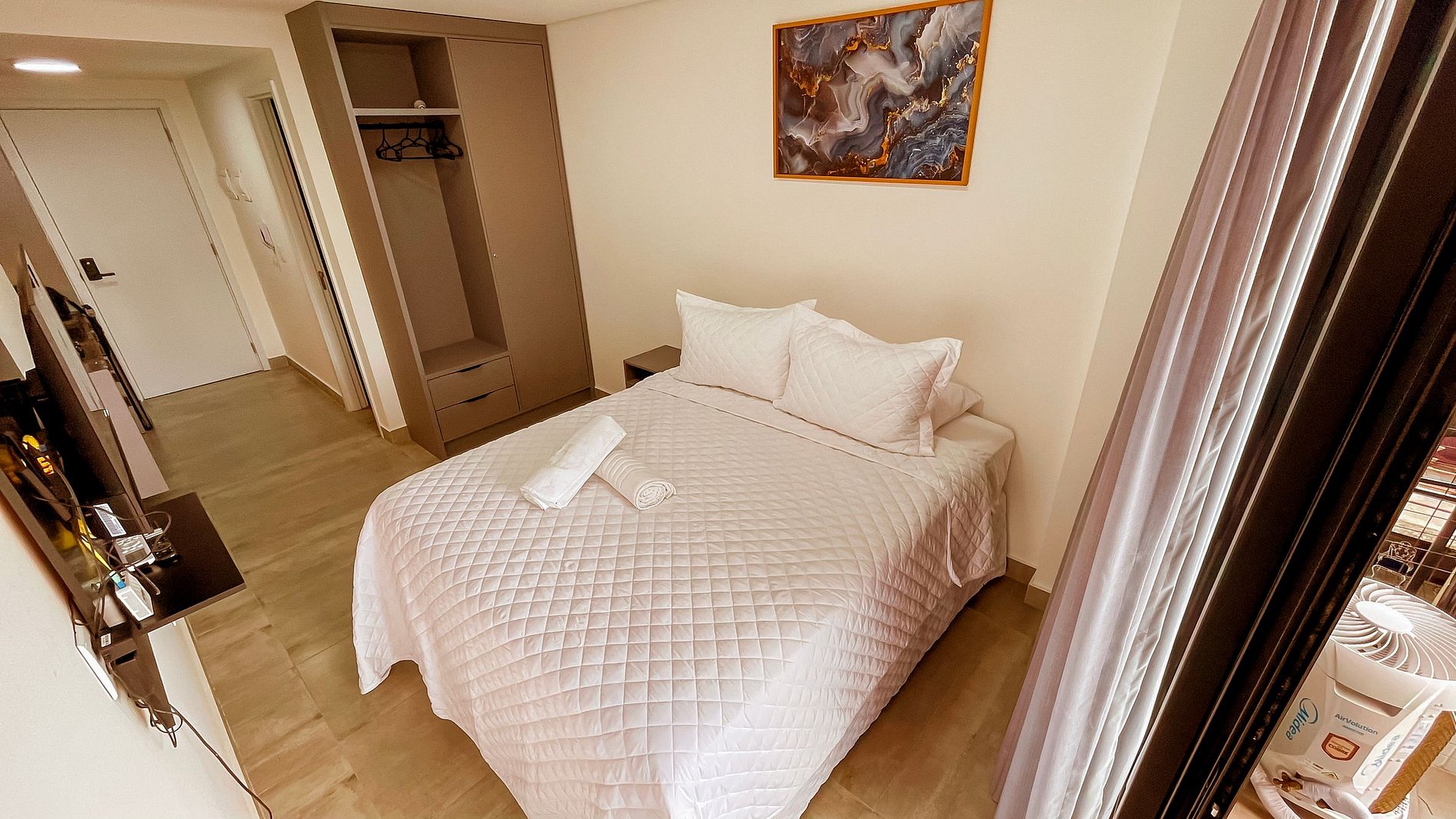O Flat Studio c/ varanda #3 acomoda 02 pessoas com cama queen, ar-condicionado e Smart TV. A cozinha é compacta, com cooktop, micro-ondas, cafeteira, sanduicheira, frigobar e utensílios para refeições rápidas. O prédio conta com piscina na cobertura, academia, lavanderia e garagem rotativa. Condomínio excelente de frente para o mar, locazilação perto de restaurantes, padarias, postos e mercadinhos. Conforto e praticidade para sua estadia!