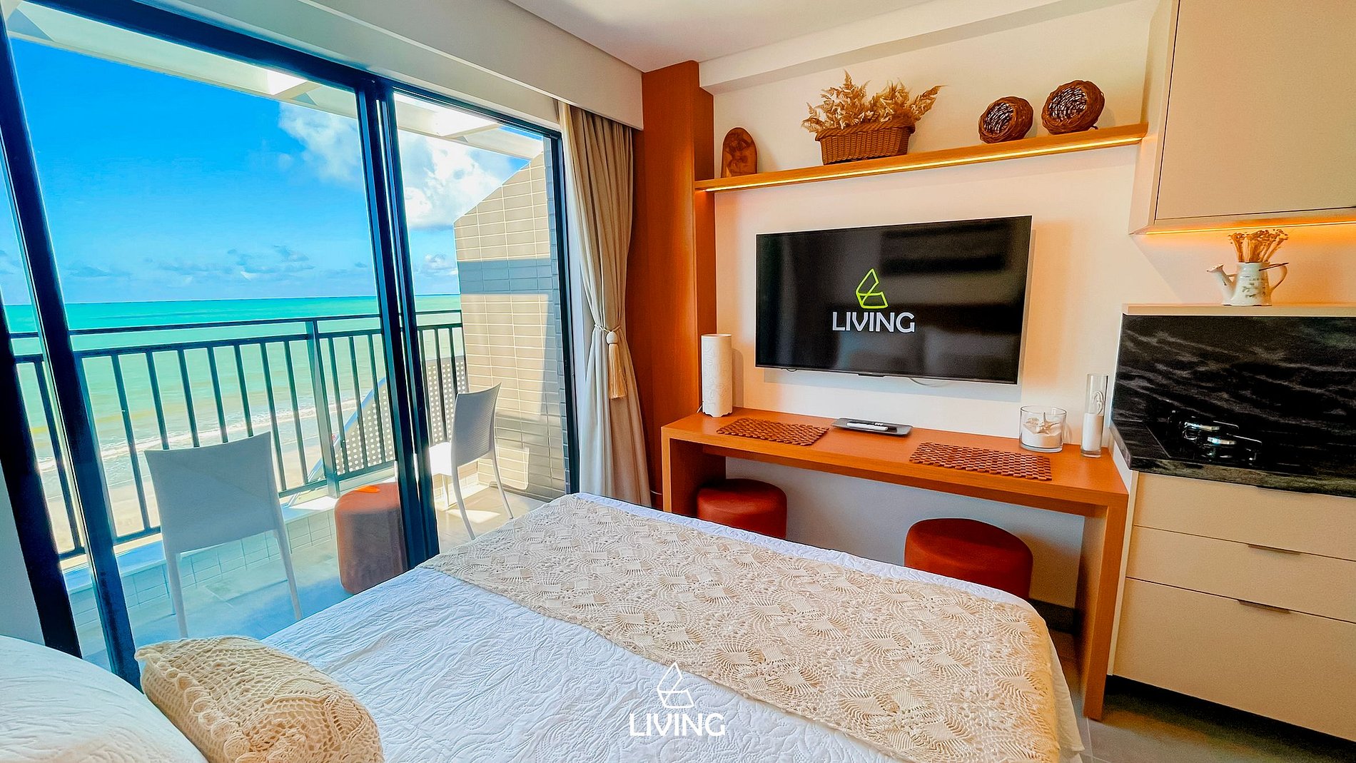 A Living disponibiliza enxoval de cama e banho, além de alguns amenities como cortesia. O flat possui ar-condicionado, Smart TV, mesa e cadeiras para refeições. Na cozinha, há utensílios para o preparo de refeições, como sanduicheira, cooktop, panelas e cafeteira. Além disso, o apartamento conta com secador de cabelo. O prédio oferece piscina, caiaques e pranchas. A lavanderia pode ser utilizada pelos hóspedes mediante pagamento pelo uso das máquinas. Fornecemos berço, rede e cadeiras de praia, sujeitos à disponibilidade.