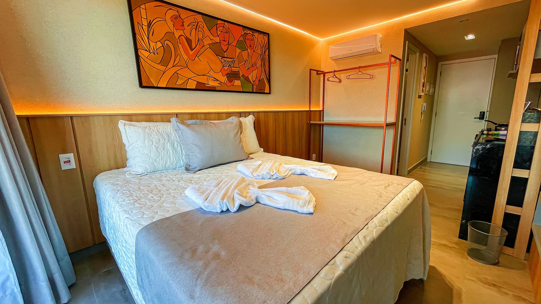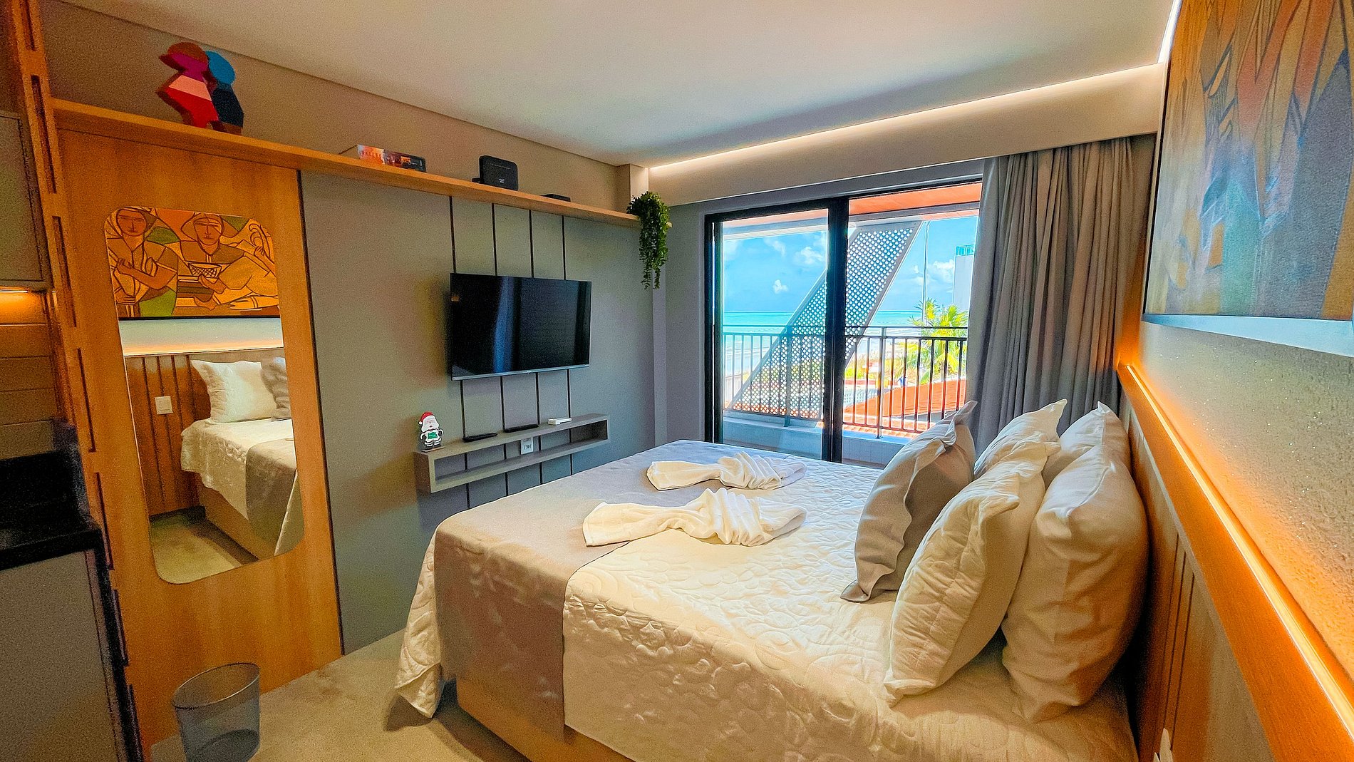 O Flat Lateral c/ Vista Mar #5 , acomoda 03 pessoas com cama casal e uma cama auxiliar de solteiro, ar-condicionado e Smart TV. A cozinha é compacta com cooktop, micro-ondas, cafeteira, sanduicheira, frigobar utensílios para refeições rápidas. O prédio conta com piscina na cobertura, academia, lavanderia e garagem rotativa. Condomínio excelente de frente para o mar, locazilação perto de restaurantes, padarias, postos e mercadinhos. Conforto e praticidade para sua estadia!
