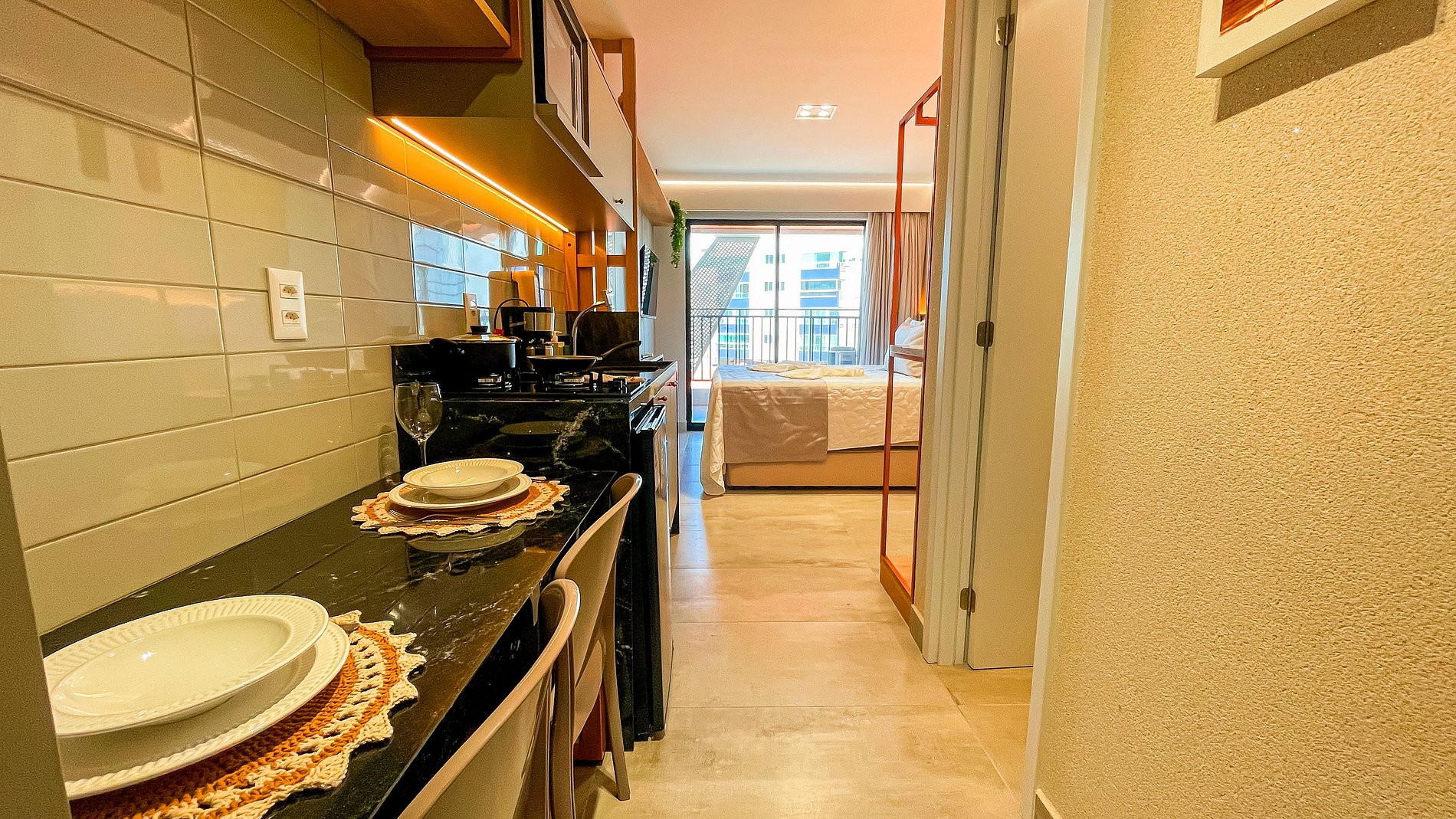 O Flat Lateral c/ Vista Mar #5 , acomoda 03 pessoas com cama casal e uma cama auxiliar de solteiro, ar-condicionado e Smart TV. A cozinha é compacta com cooktop, micro-ondas, cafeteira, sanduicheira, frigobar utensílios para refeições rápidas. O prédio conta com piscina na cobertura, academia, lavanderia e garagem rotativa. Condomínio excelente de frente para o mar, locazilação perto de restaurantes, padarias, postos e mercadinhos. Conforto e praticidade para sua estadia!