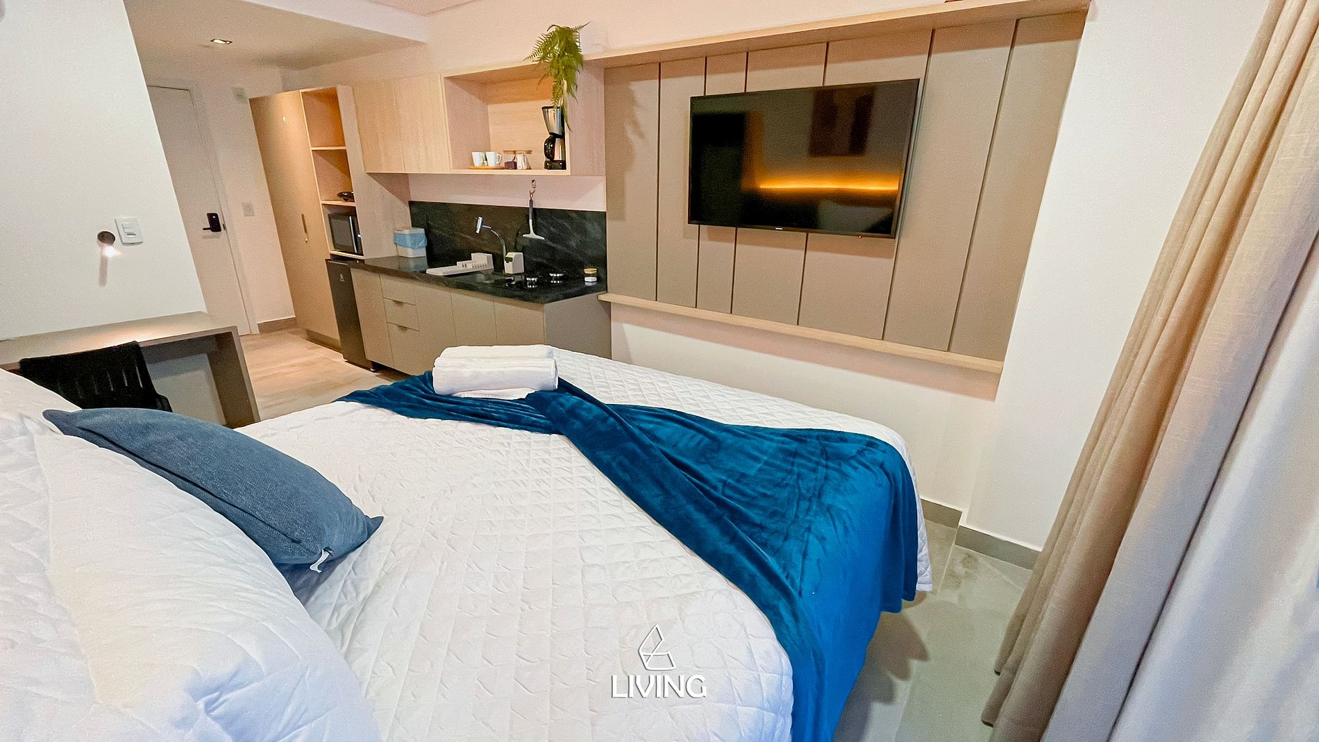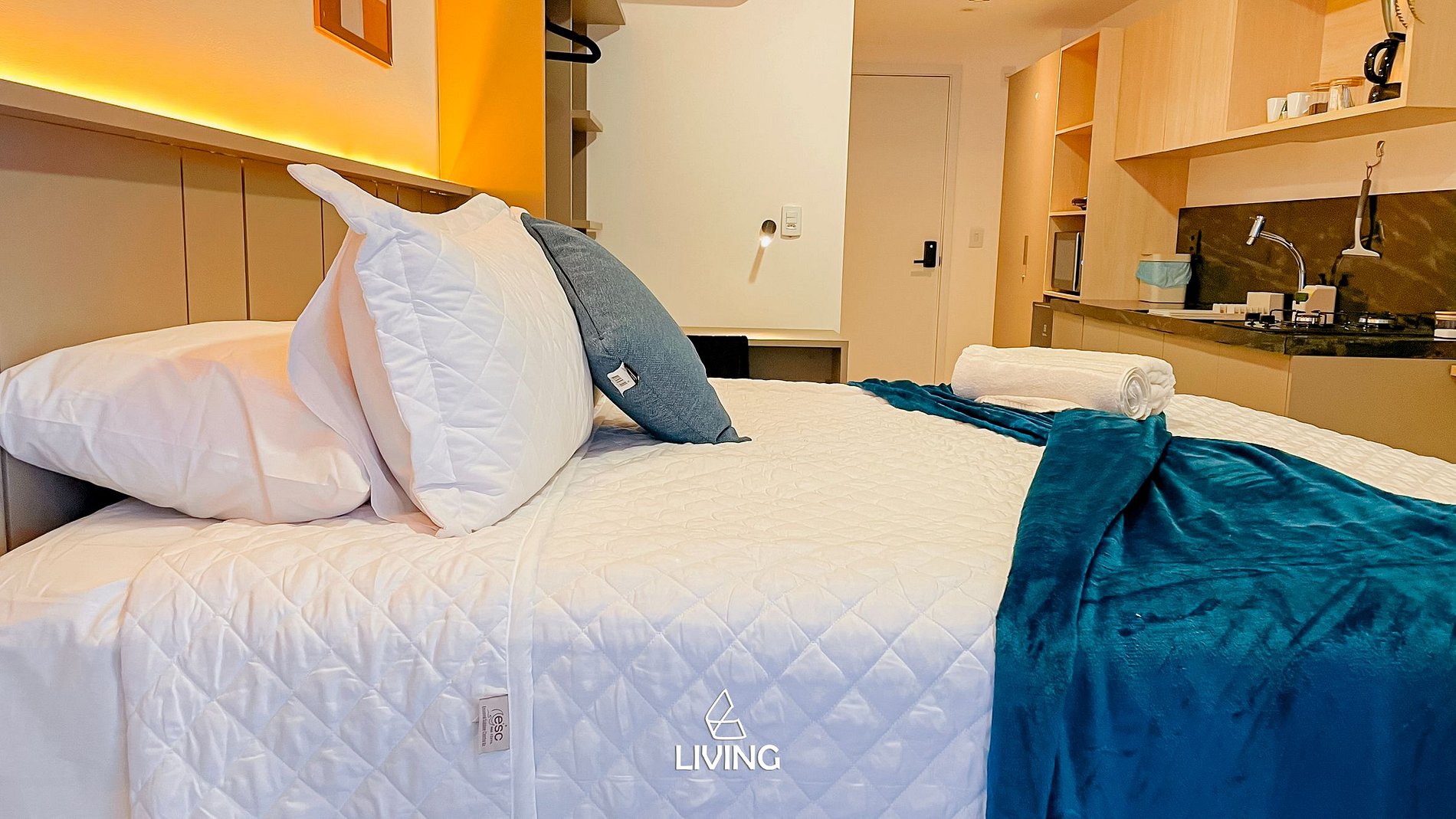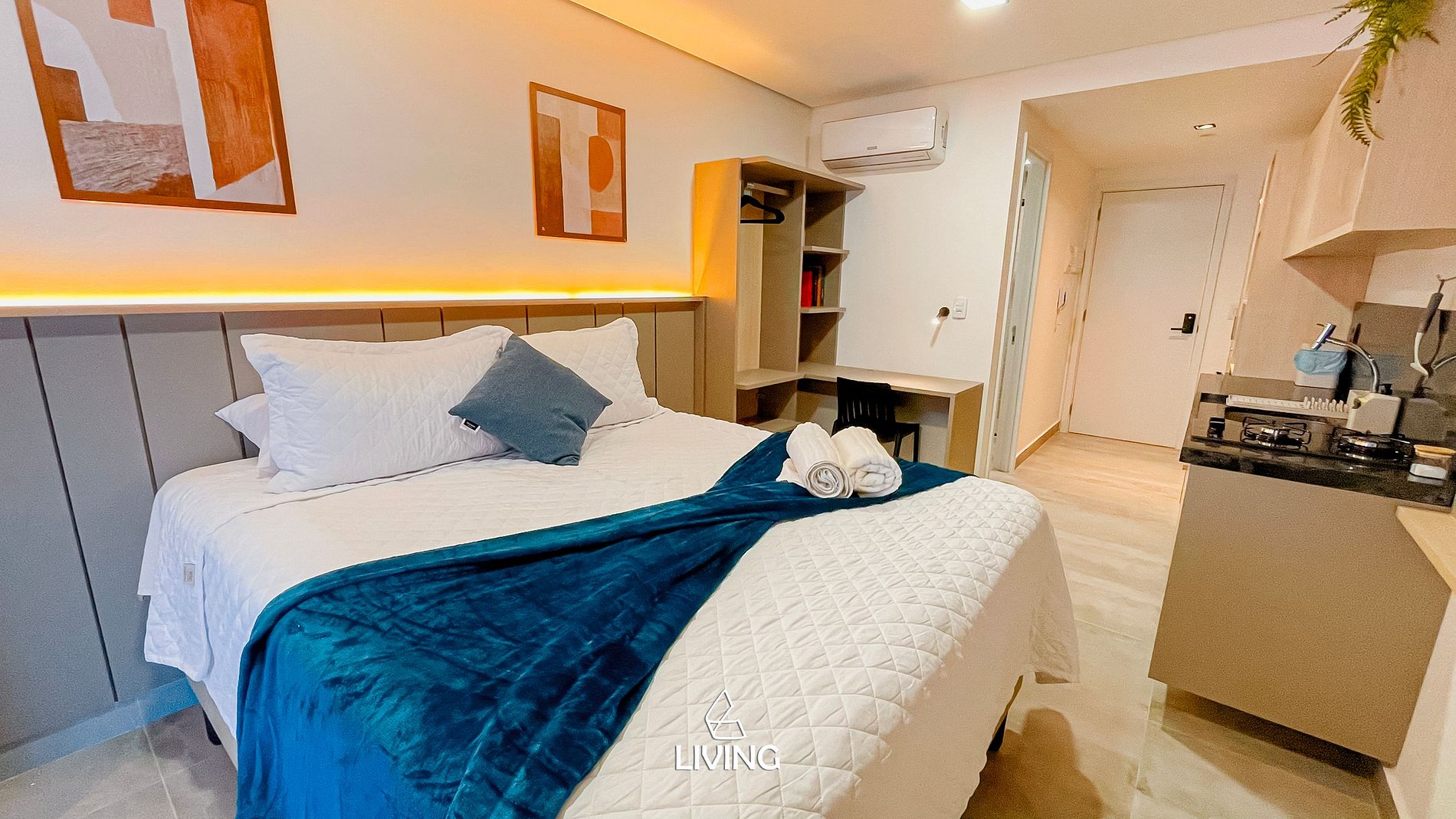 A Living disponibiliza enxoval de cama e banho, além de alguns amenities como cortesia. O flat possui ar-condicionado, Smart TV, mesa e cadeiras para refeições. Na cozinha, há utensílios para o preparo de refeições, como sanduicheira, cooktop, panelas e cafeteira. Além disso, o apartamento conta com secador de cabelo. O prédio oferece piscina, caiaques e pranchas. A lavanderia pode ser utilizada pelos hóspedes mediante pagamento pelo uso das máquinas. Fornecemos berço, rede e cadeiras de praia, sujeitos à disponibilidade.