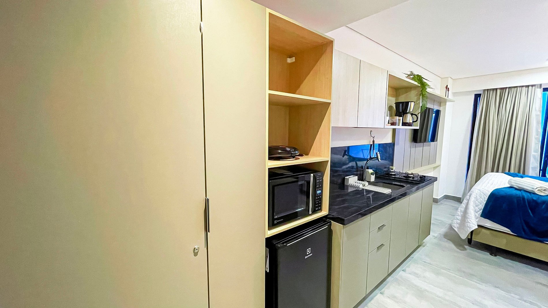 O Flat Studio #2 acomoda 03 pessoas com cama queen mais uma cama solteiro auxiliar, ar-condicionado e Smart TV. A cozinha é compacta, com cooktop, micro-ondas, cafeteira, sanduicheira, frigobar e utensílios para refeições rápidas. O prédio conta com piscina na cobertura, academia, lavanderia e garagem rotativa. Condomínio excelente de frente para o mar, locazilação perto de restaurantes, padarias, postos e mercadinhos. Conforto e praticidade para sua estadia!